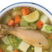 Rico Caldo de pollo con chayote, calabaza, zanahoria, elote, papas y repollo