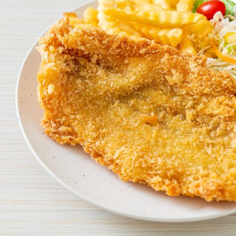 Filete de tilapia empaniado acompañado de papás a la francesa y juguito.
