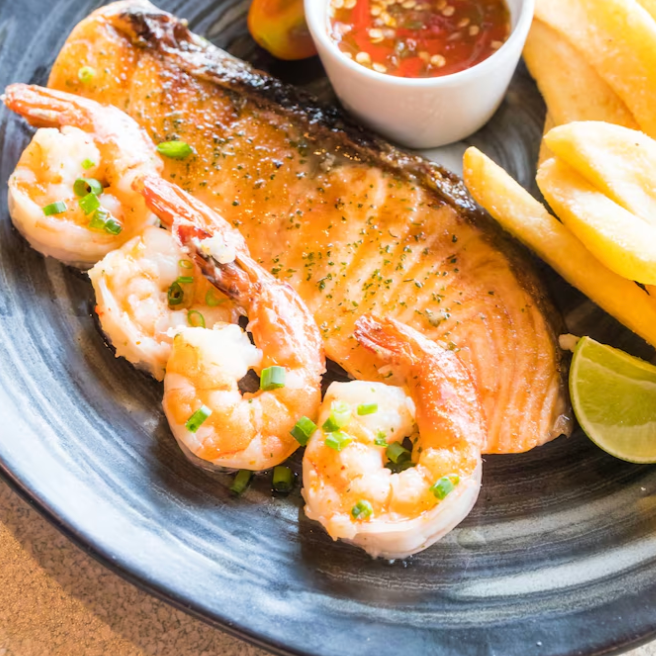 Camarones zarandeados a la parrilla y gratinados con queso menonita.Acompañados de ensalada y papas confitadas.