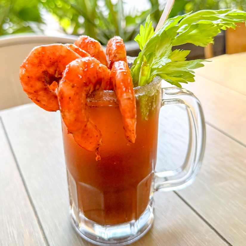 Clamato preparado con jugo de limón y salsas negras de la casa y camarones cocidos.