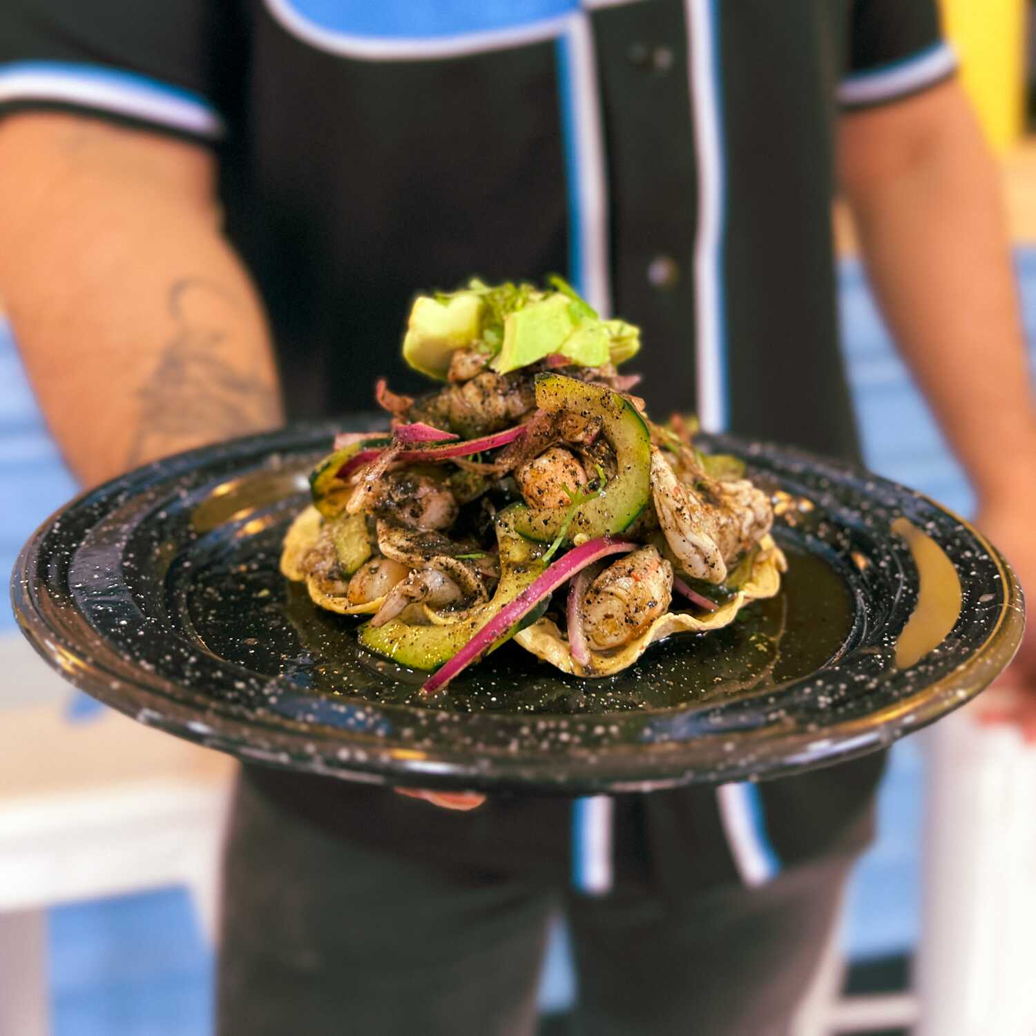 Ceviche de camarón ahogado y cocido con callo de hacha, bañada en aguachile negro de habanero y coronada con aguacate.