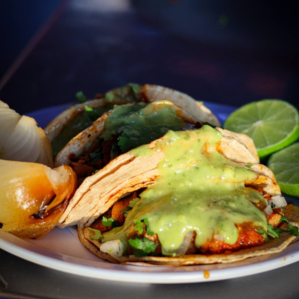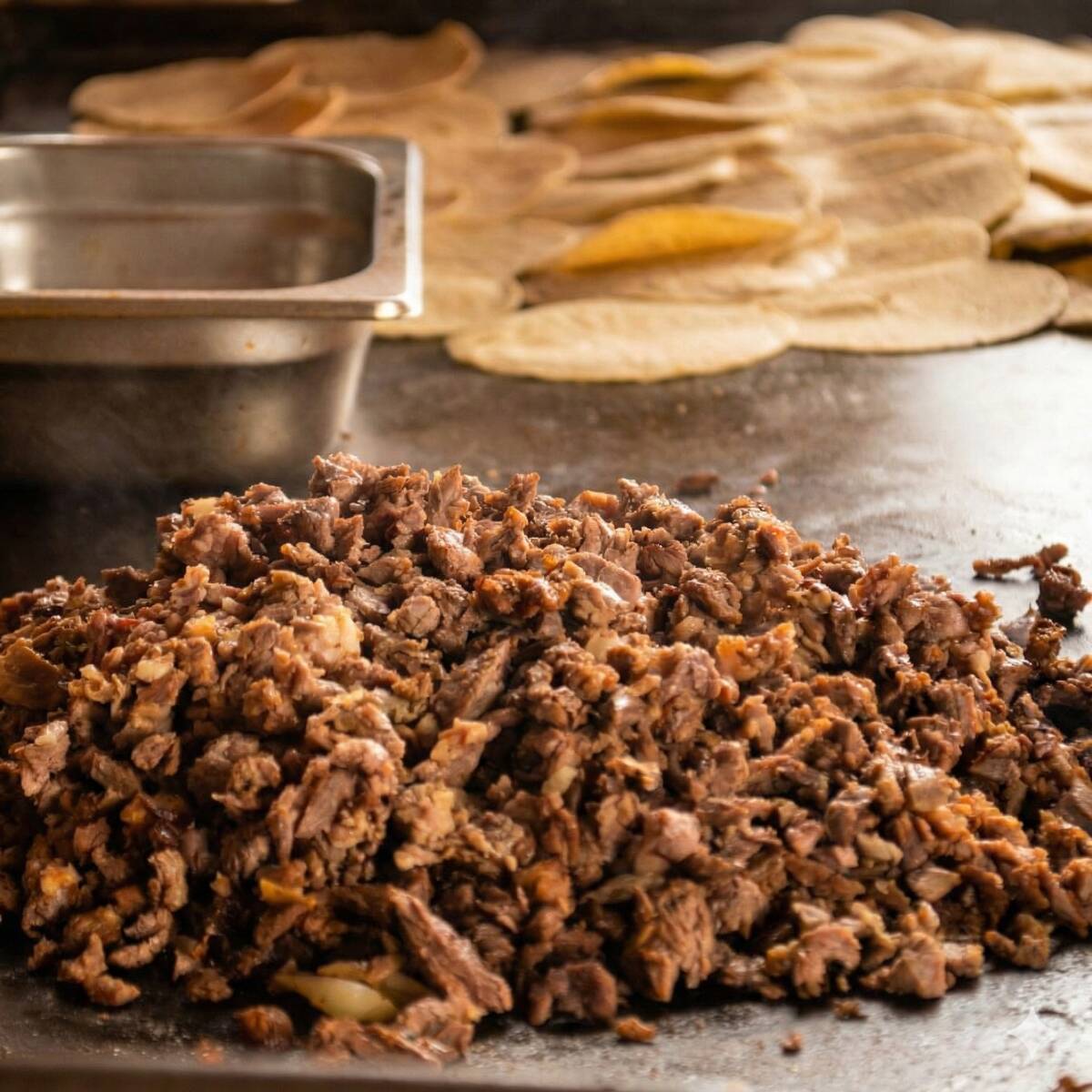 Doble Tortilla de Maíz 12cm con La mejor Birria de Res. Cebolla, cilantro, salsa, guacamole y limones se envían aparte.