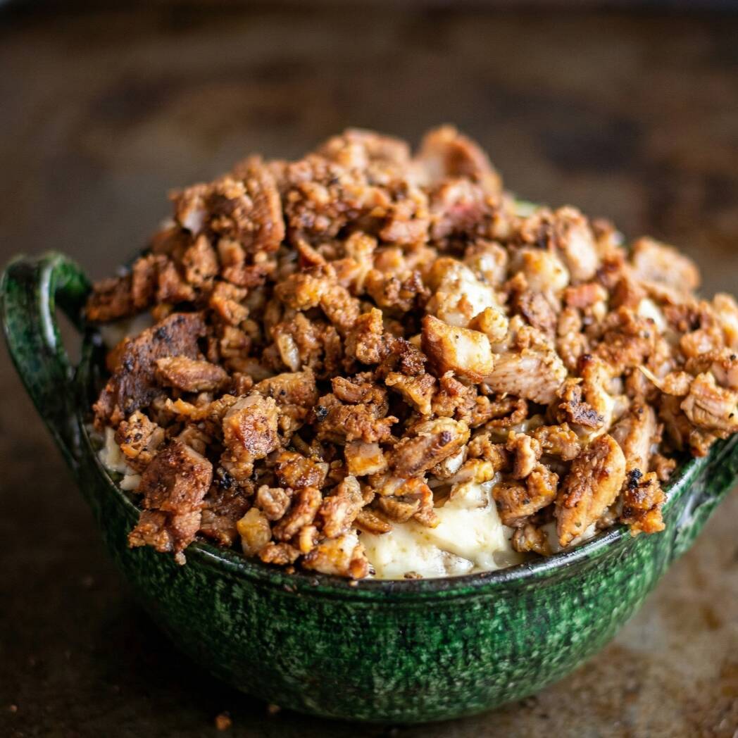 Arrachera o Costilla, Cebolla, pimiento morron, tocino todo gratinado con quesillo. incluye Tortillas y salsas. se envían por separado.