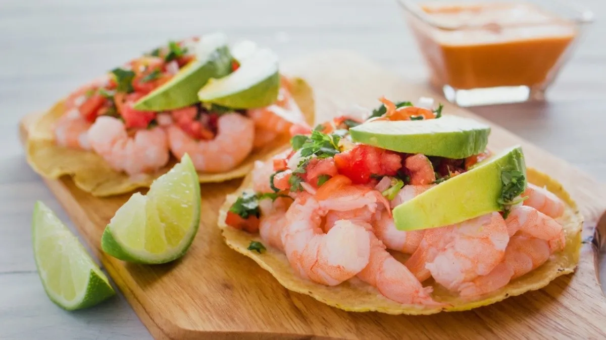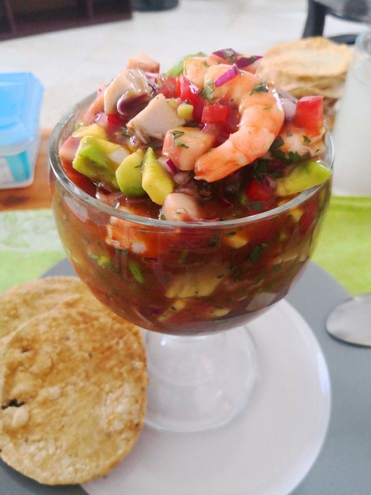 Camarón sazonada con salsa de la casa, acompañada de tomate, cebolla morada, pepino y aguacate.