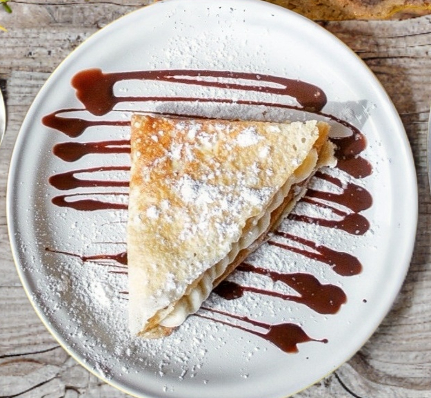 Tortilla de harina rellena de plátano, queso crema y chocolate liquido.