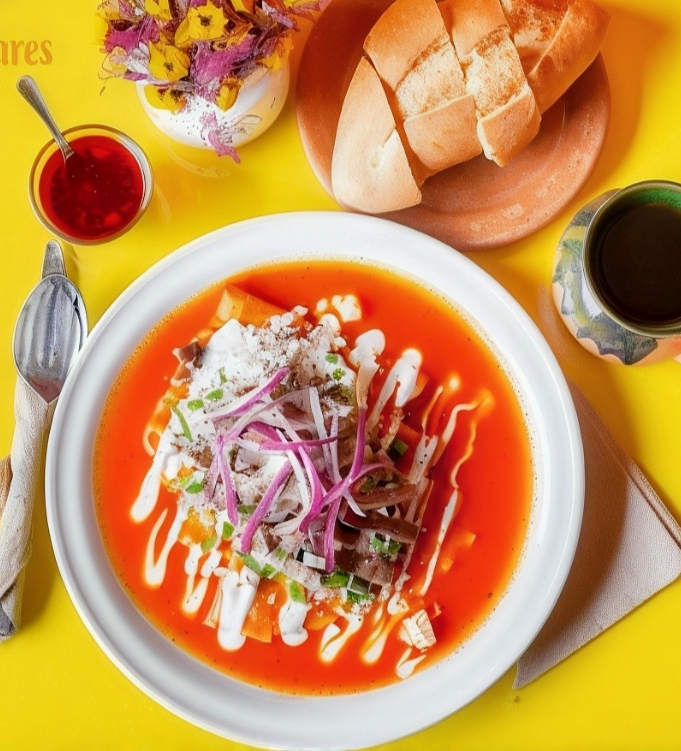 Una porción de totopos bañados con mole coloradito, lechuga fresca,queso,crema, cebolla, acompañado con la carne a elegir, una pieza de bolillo y agua fresca del día.