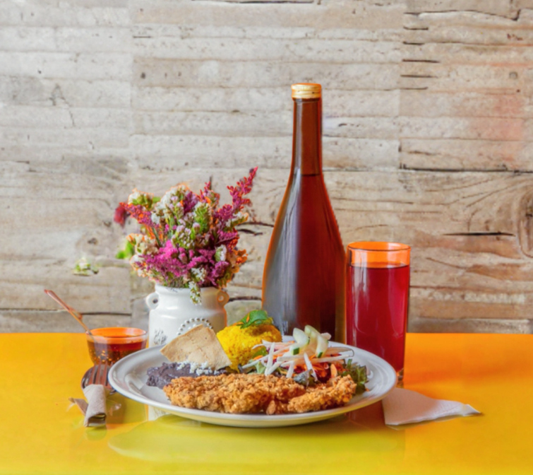 Una pieza de milanesa rellena de quesillo y hierba santa, bañada en coloradito, acompañad de ensalada fresca, dos tortillas hechas a mano y agua natural del día..
