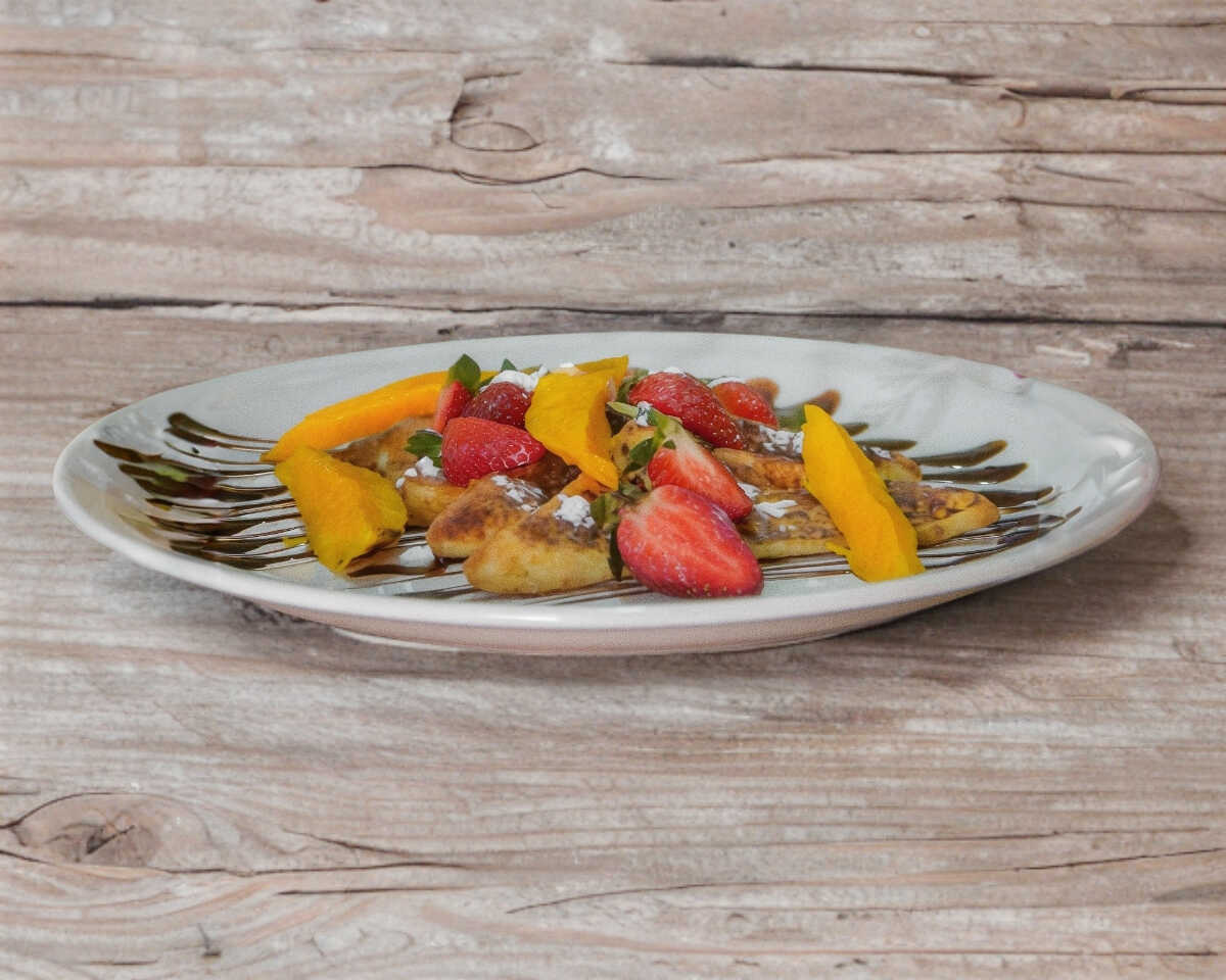 4 piezas de pan fránces espolvoreada con canela y azúcar, chocolate liquido, fruta de temporada.