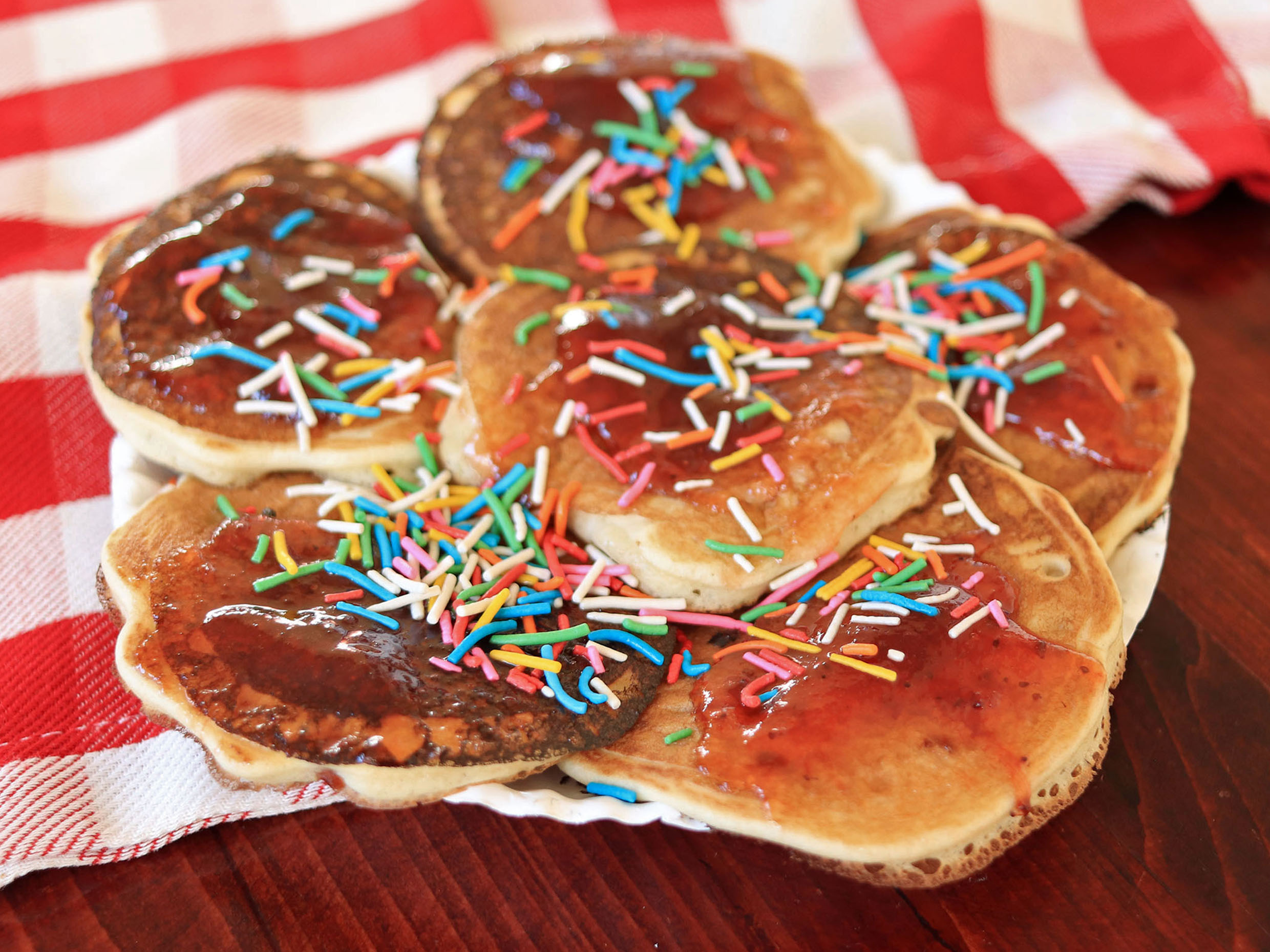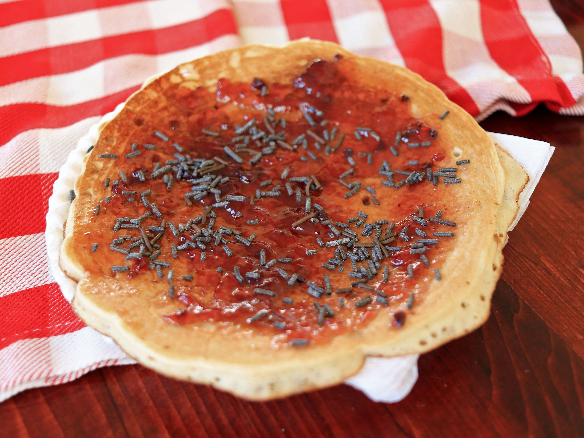 Hot-cakes con mermelada de fresa.