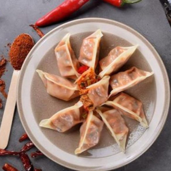 Empanadas al vapor rellenas de kimchi y salsa buldak acompañadas con salsa de soja