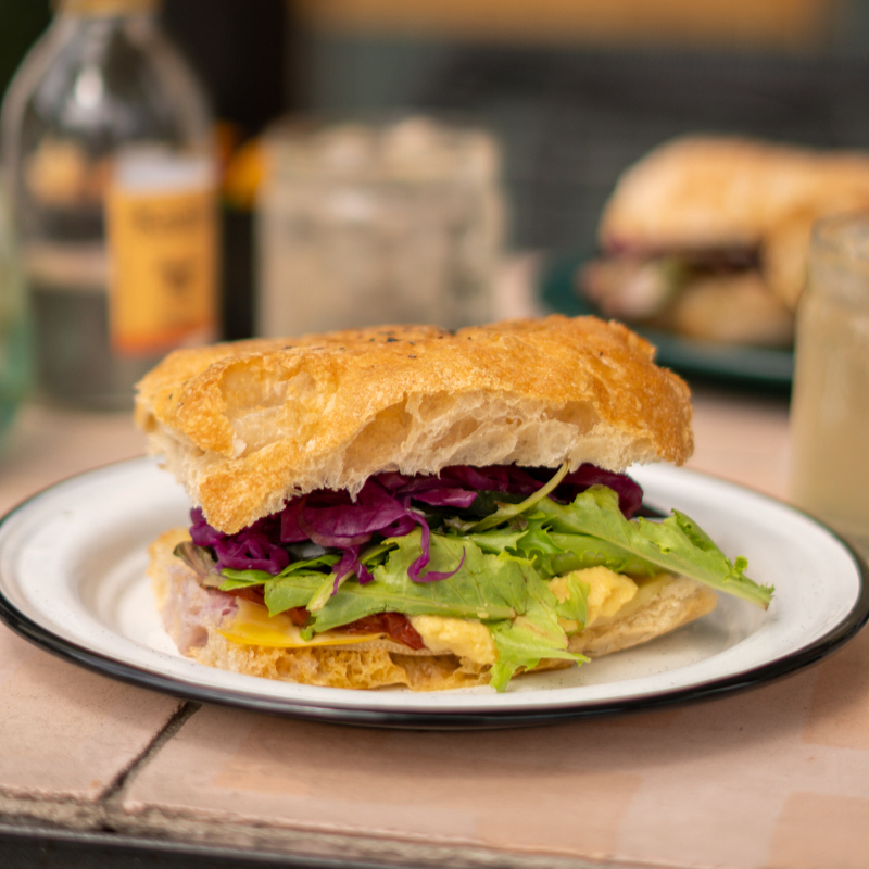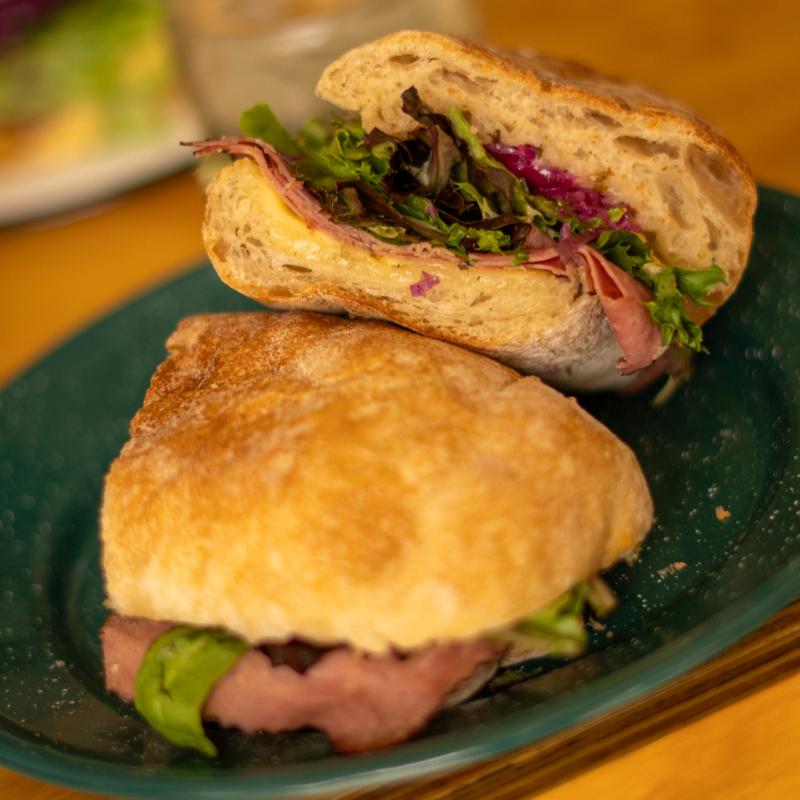 Ciabatta de Roast Beef con aderezo chimichurri, queso gouda, queso edam, mixdelechugas, chocrut y pepino