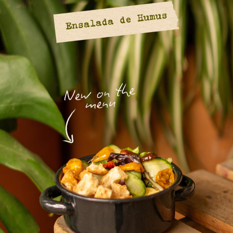 Focaccia con queso gouda, queso edam, tomate, humus, mix de lechugas, chocrut y pepino