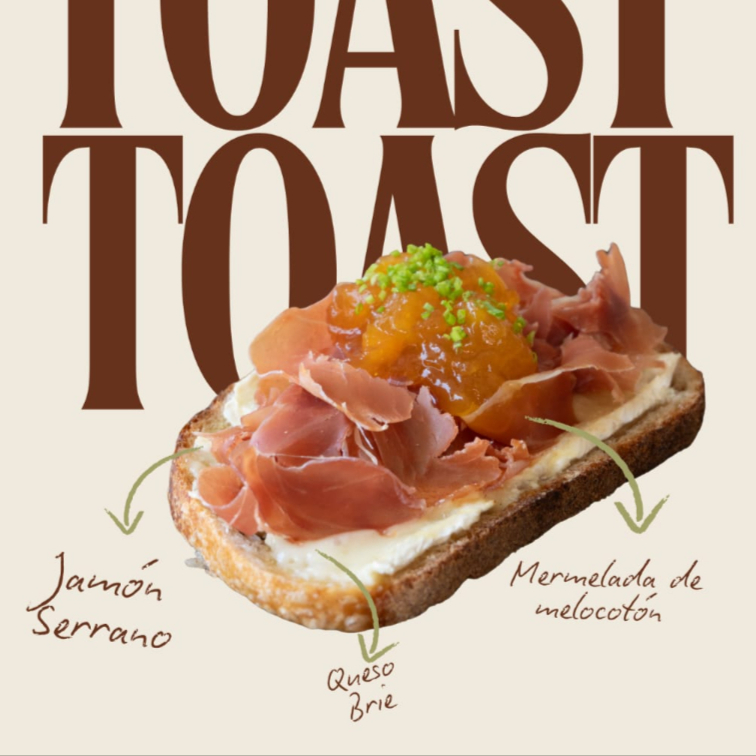 Toast de jamón serrano con queso brie, mermelada de melocotón artesanal y cebollin