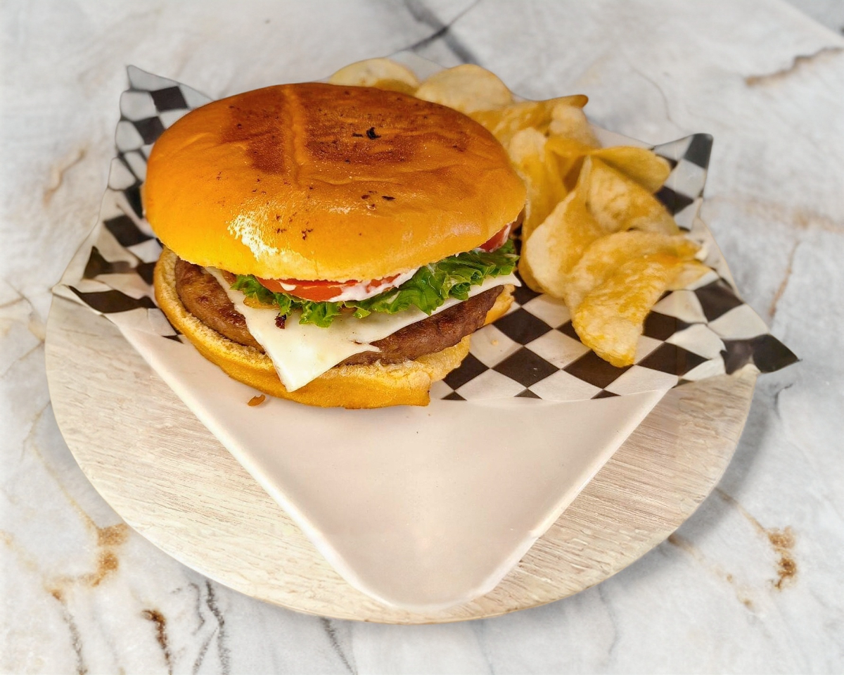 340 GRS DE SIRLON (RES), Q. MANCHEGO, AROS DE CEBOLLA, TOCINO, TOMATE, MIX DE LECHUGA, MAYONESA, CATSUP Y PAN ARTESANAL BRIOCH