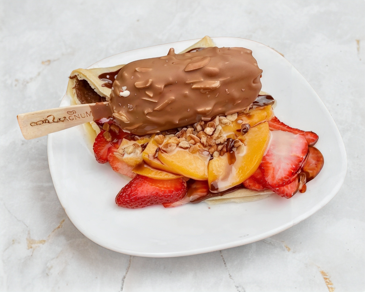 Deliciosa crepa con nutella, fruta de temporada, durazno,Hersey´s, nuez y mini Magnum