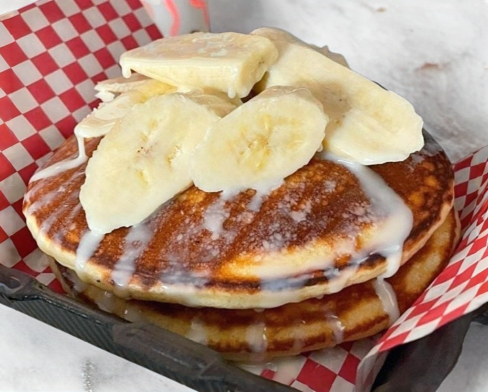 Hot cakes con tocino y huevo revuelto,