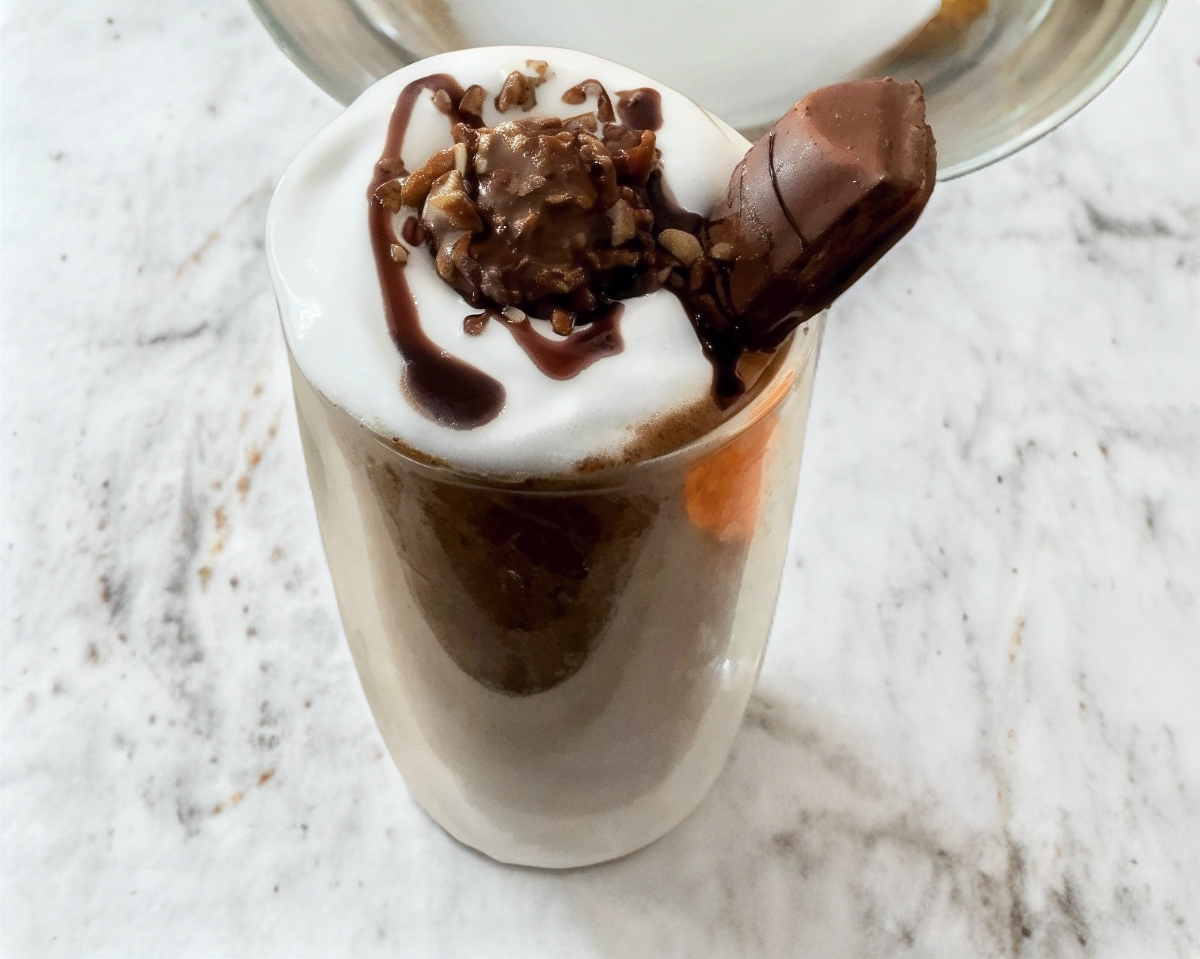 Leche, hielo, carga de café, crema batida, helado de vainilla, bayles, nuez, azúcar.