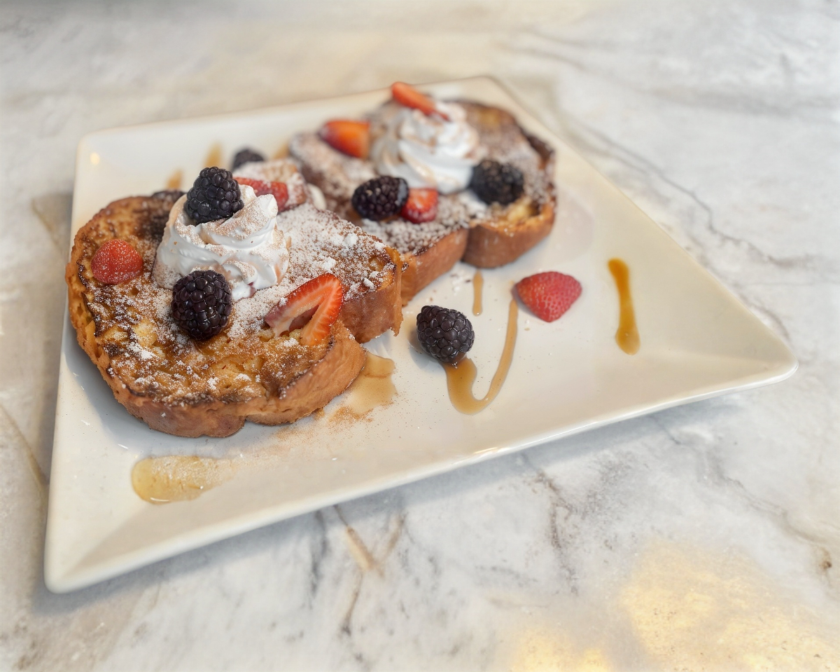 Pan brioche, azúcar, canela, chantilly, maple y fruta de temporada