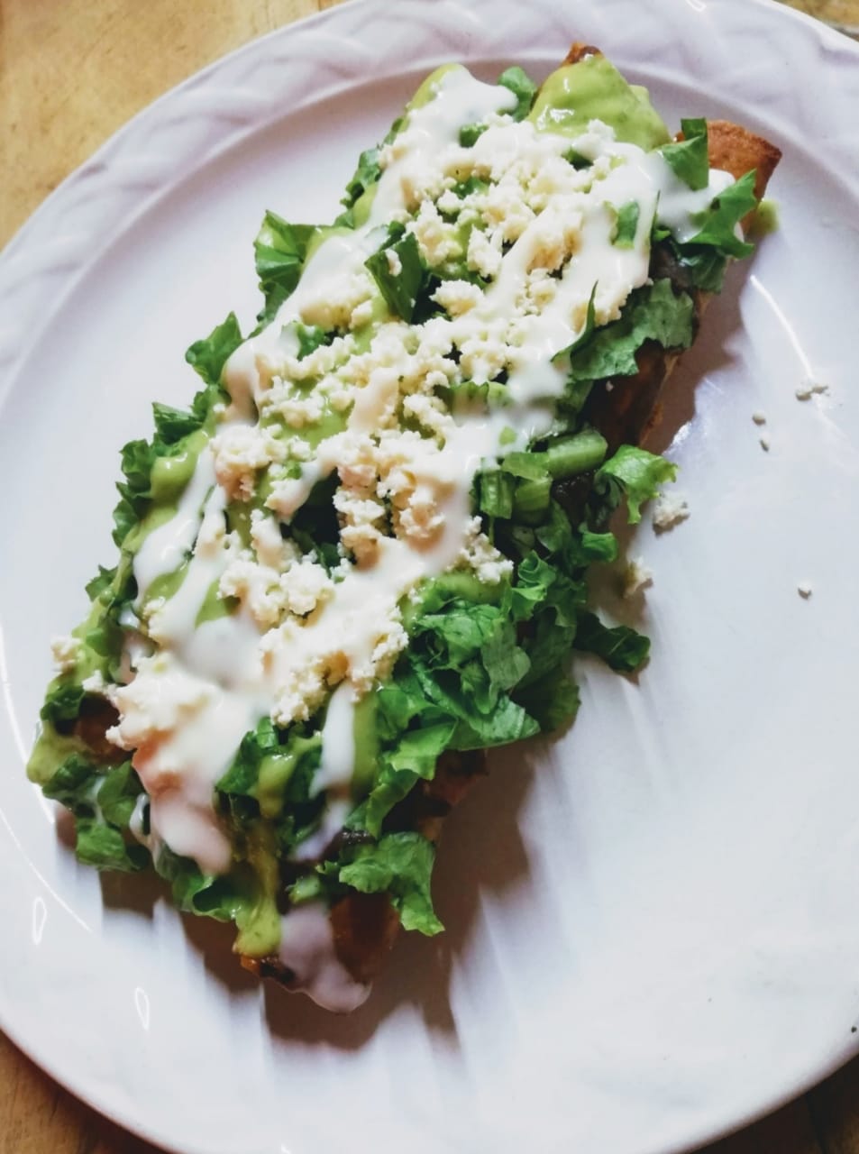 Encima lleva Frijoles, lechuga, queso, crema y guacamole.