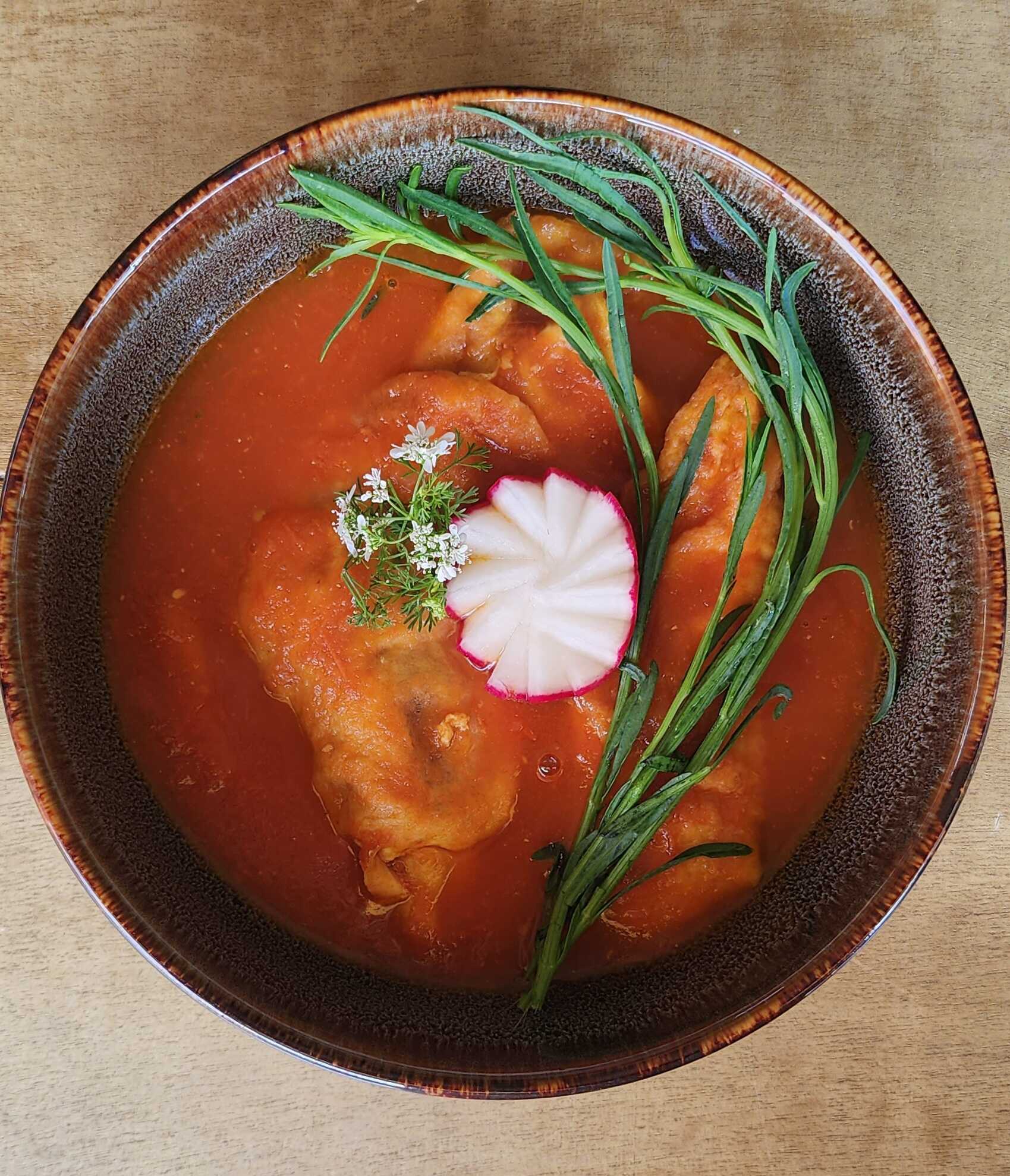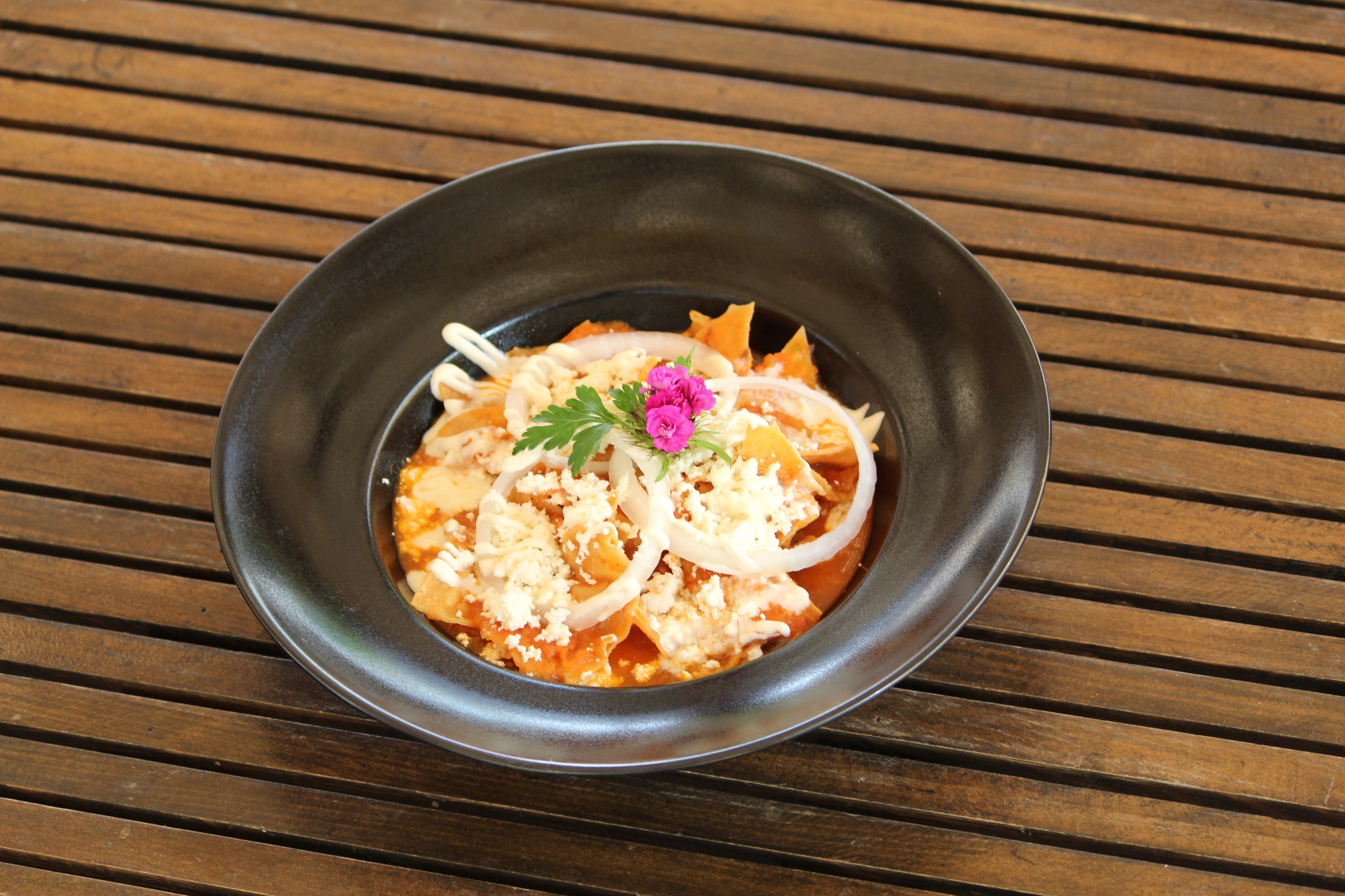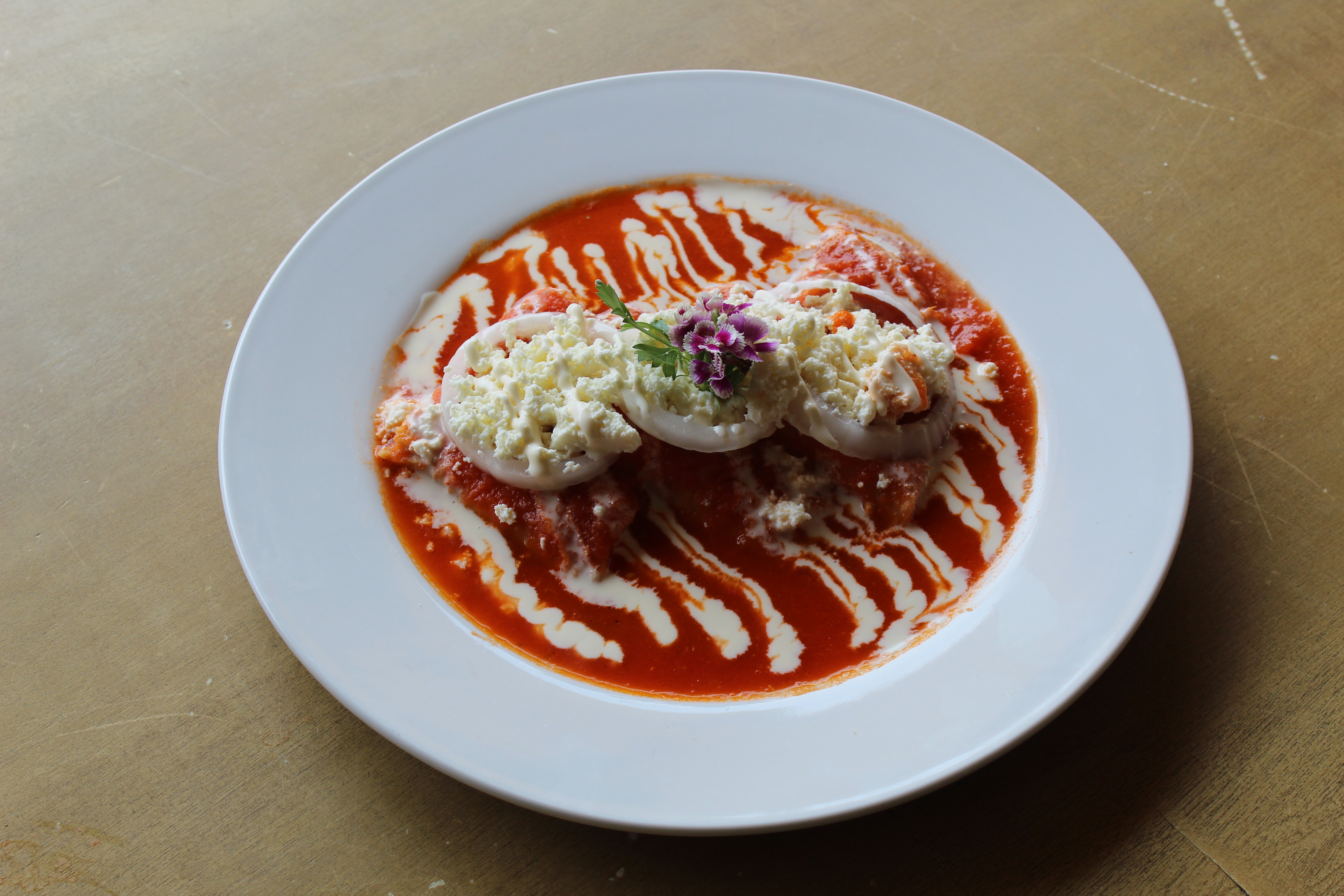 Tortillas de maíz bañada con salsa roja de tomate, servidas con queso fresco cebolla y crema.