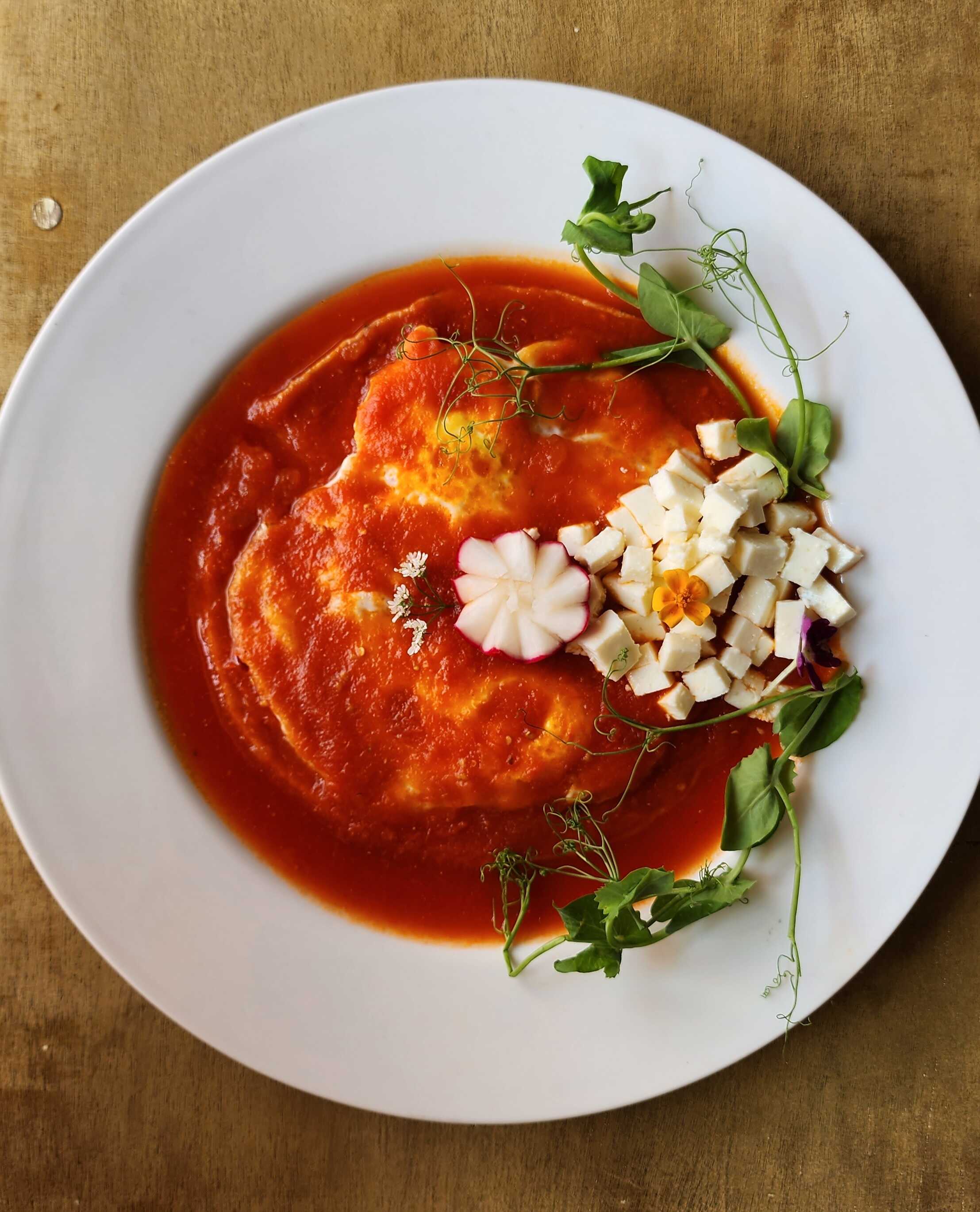 Pan de masa madre, base de pesto de epazote y queso manchego, tomate cherry salteado saltado y mix de hojas.