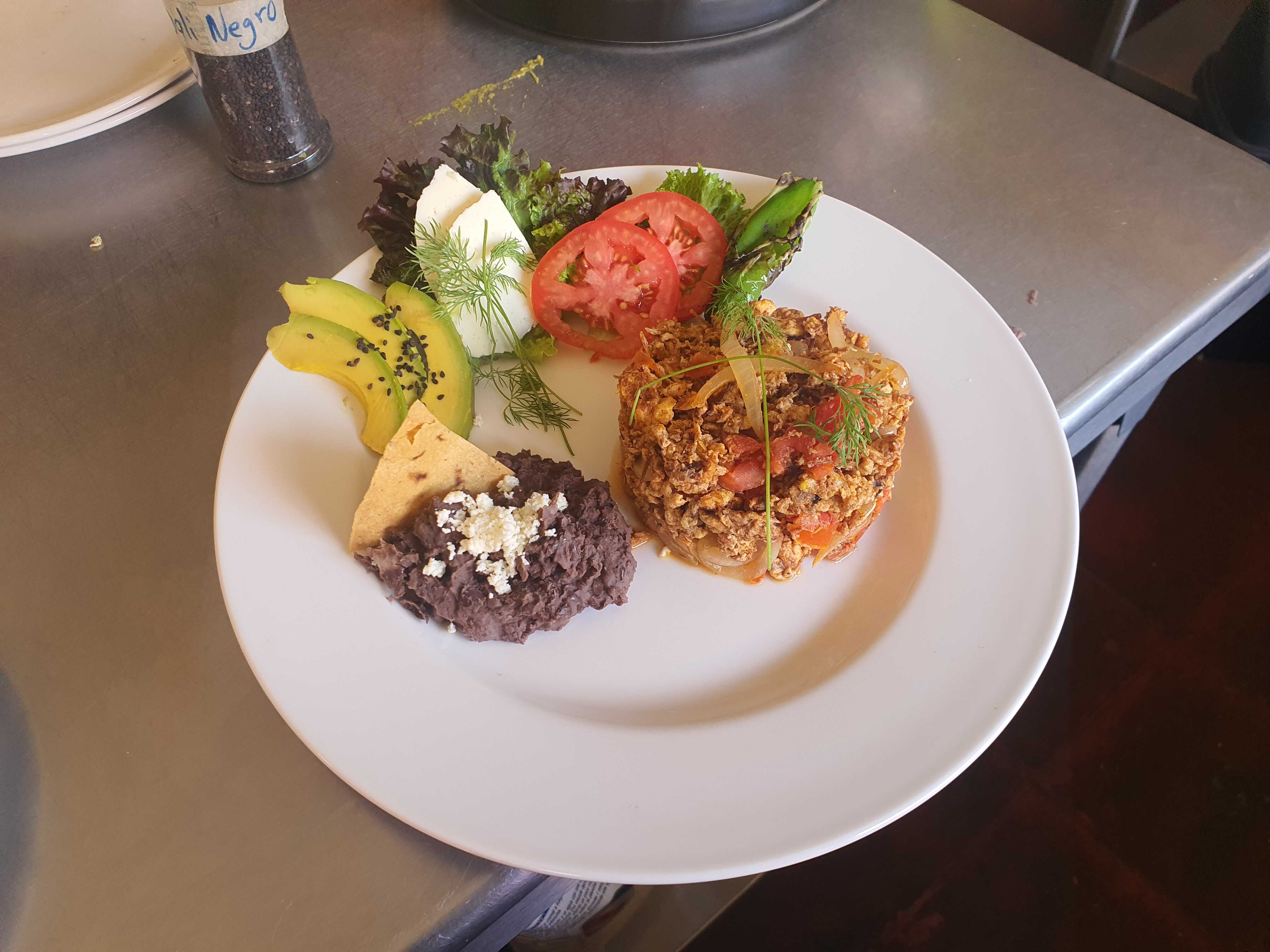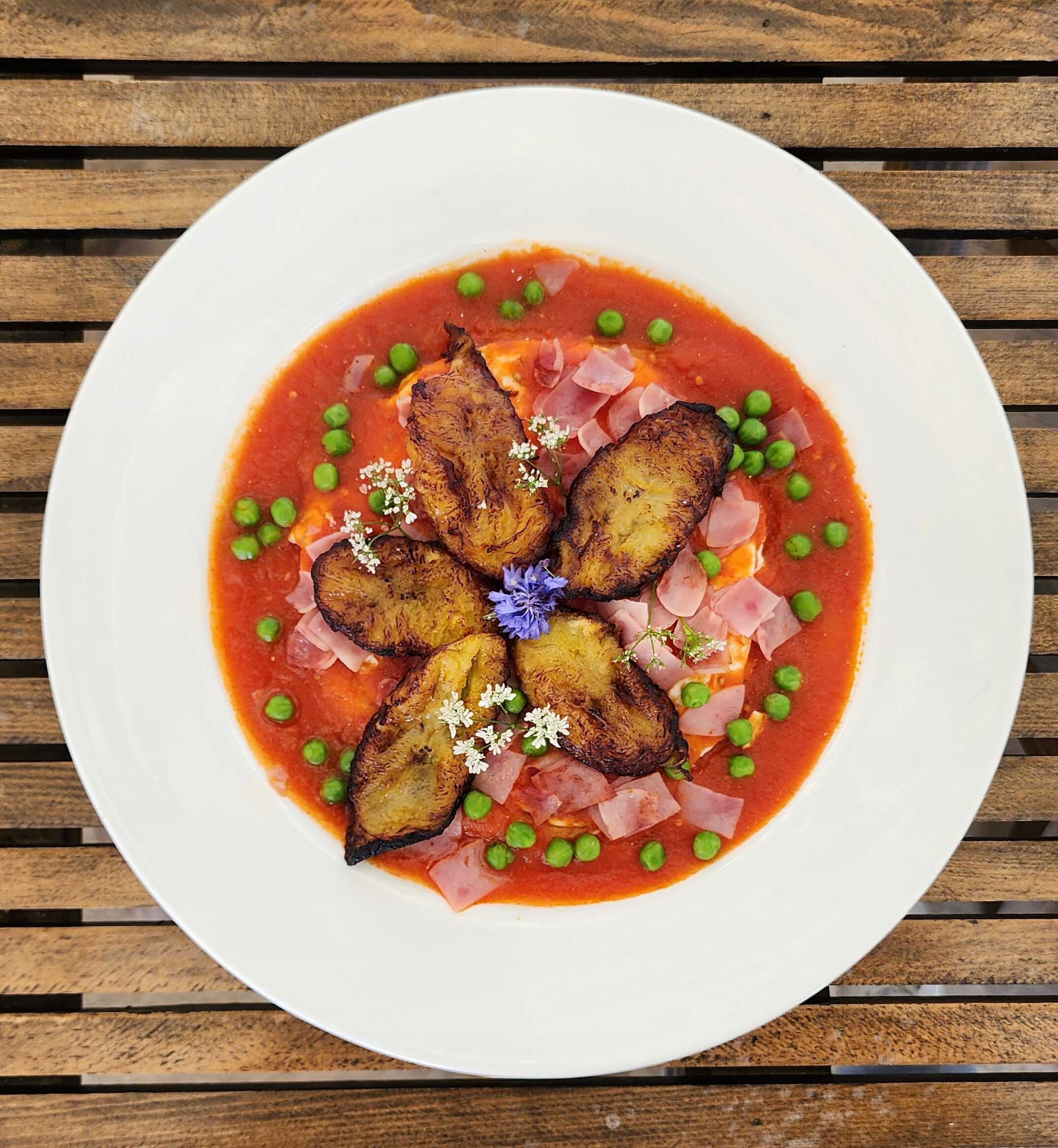 Huevos estrellados, servidos sobre tortilla frita y cama de frijoles refritos, bañados con salsa picante de tomate, chicharos, jamón y rebanadas de plátano frito.