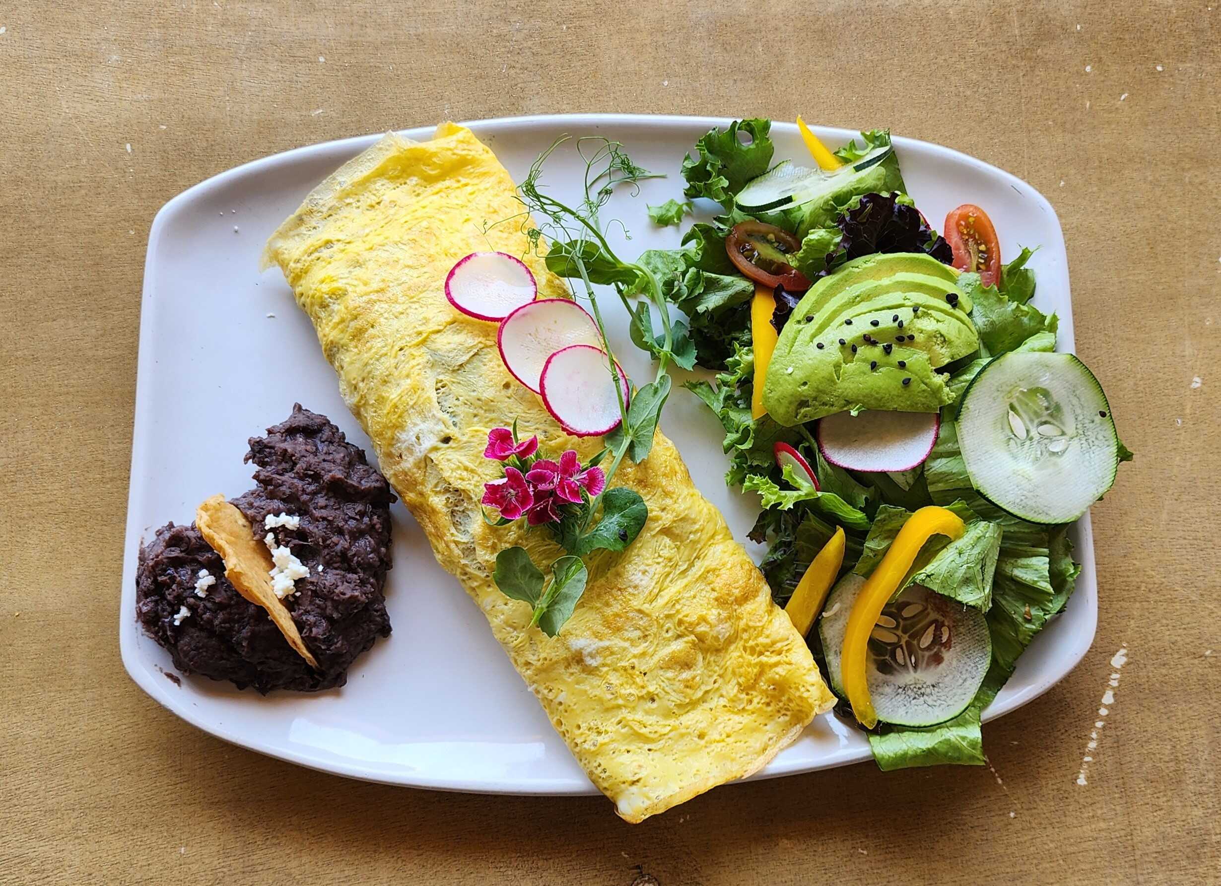 Relleno de champiñones, elote, cebolla morada, epazote y quesillo, acompañado con ensalada. Haz tu omelette de claras por $30.