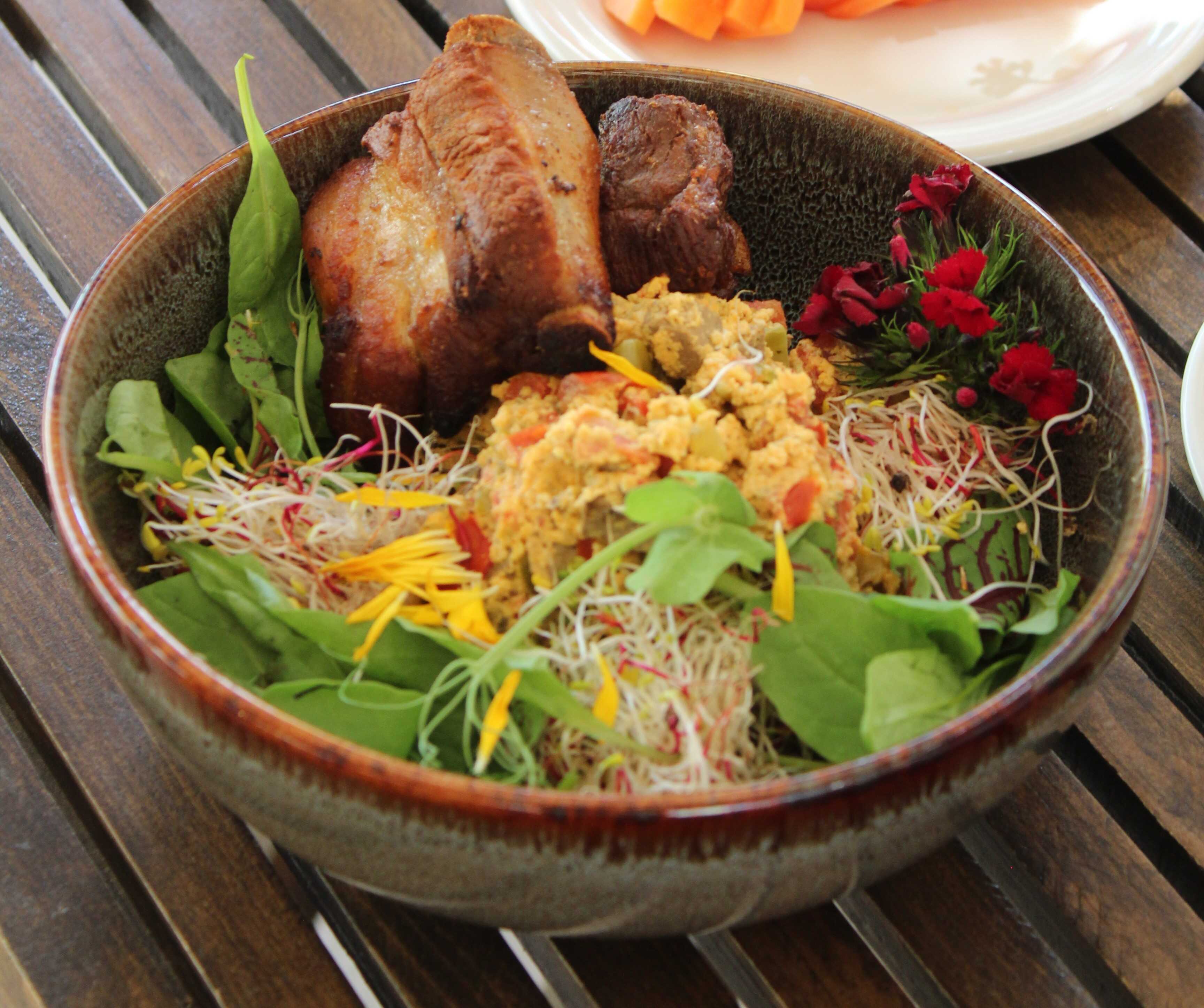 Tradicionales higaditos de pueblo, servicios con costilla frita.