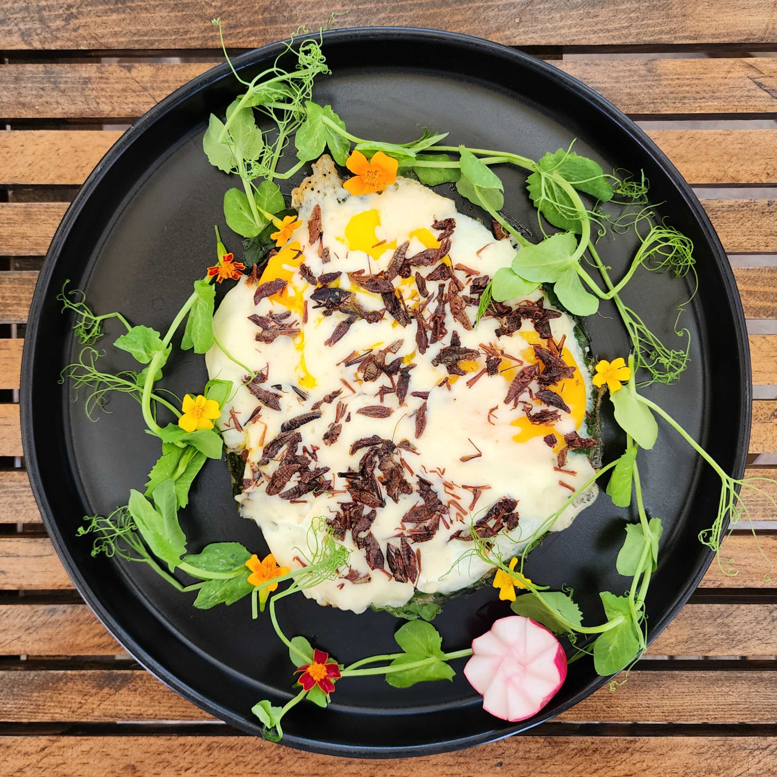 Huevos montados sobre hoja santa, cubiertos de quesillo y chapulines, acompañados con frijoles refritos.