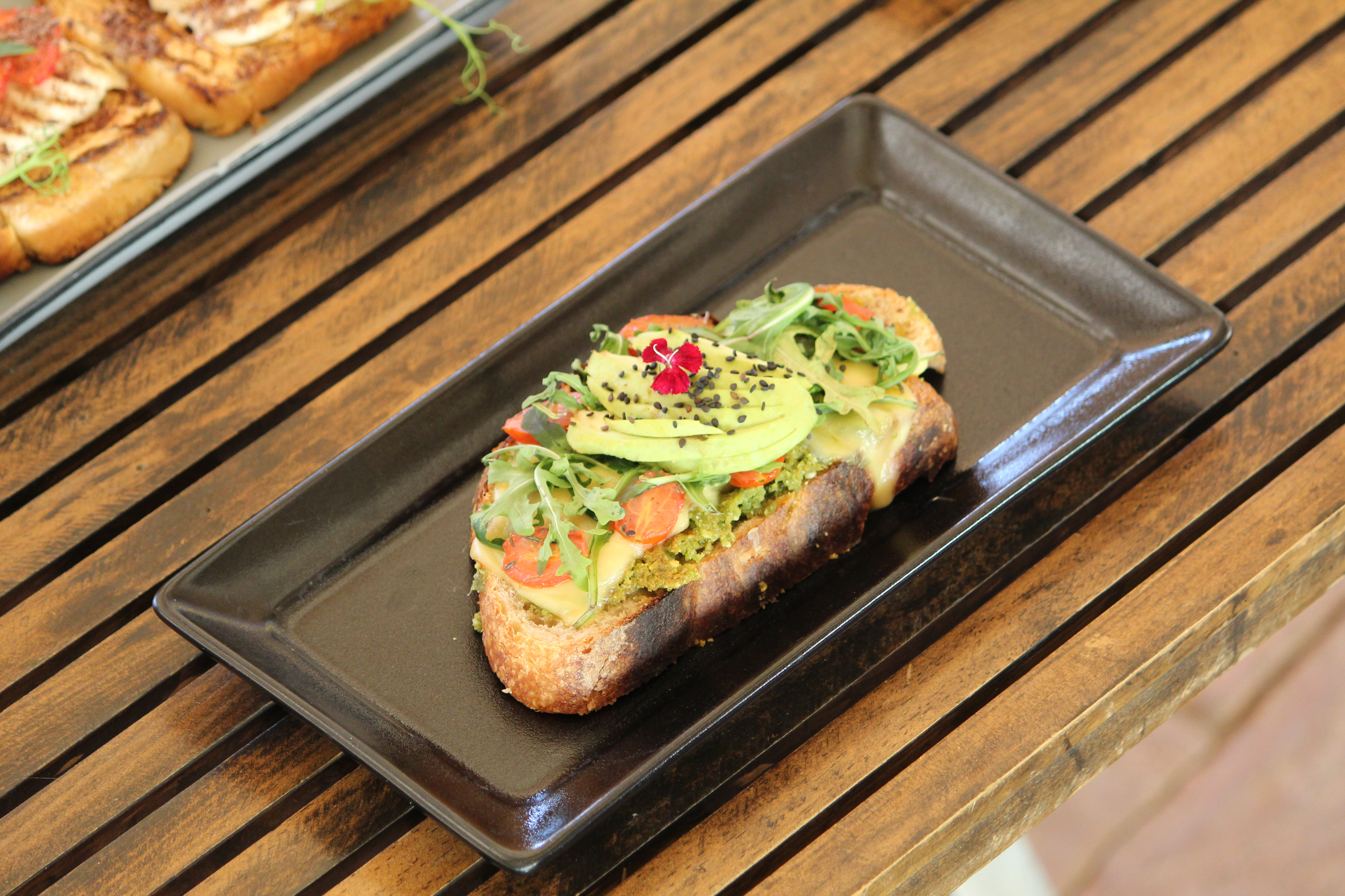 Pan de masa madre, base de queso panela o cotaffe, aguacate, tomate, cherry fresco y albahaca