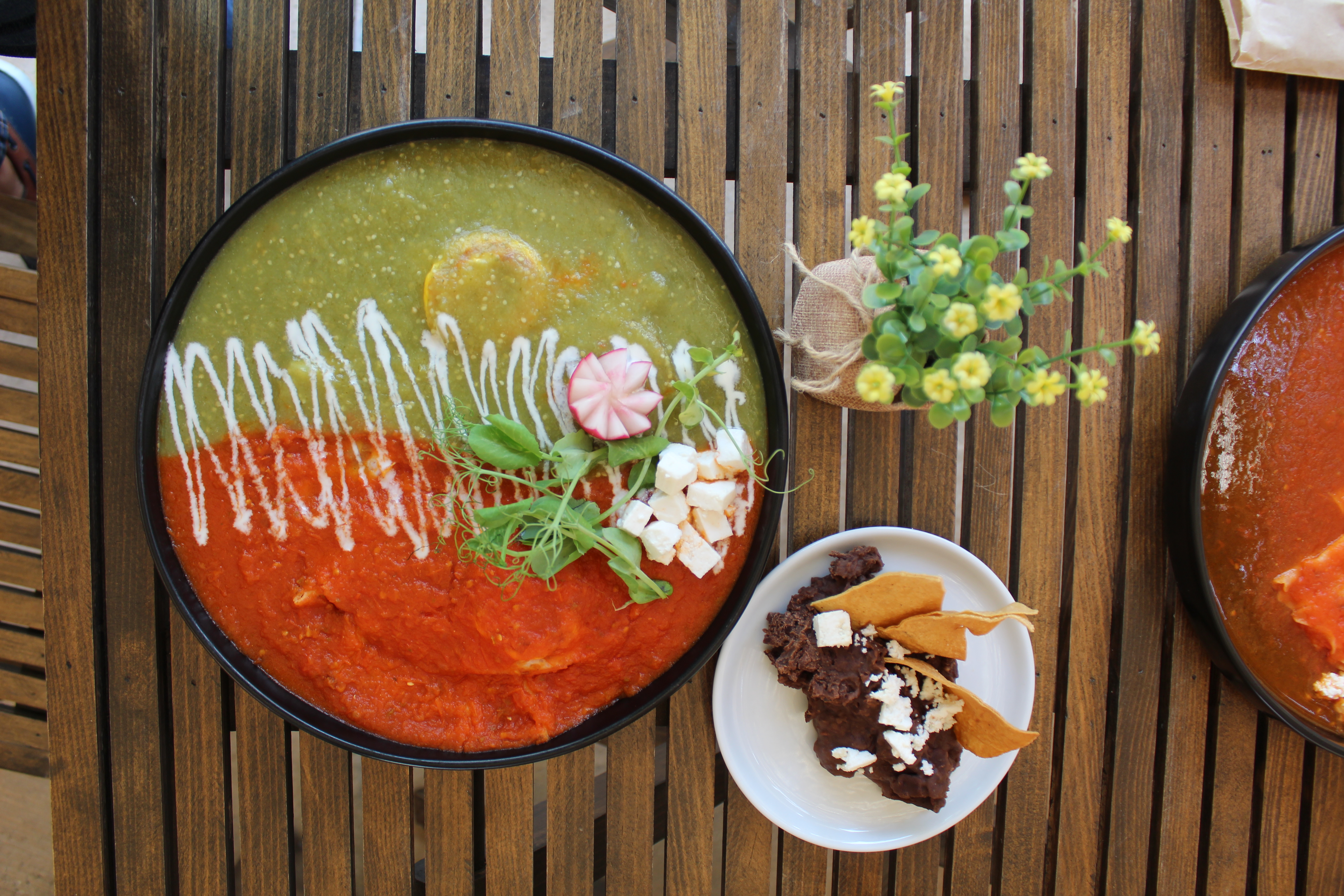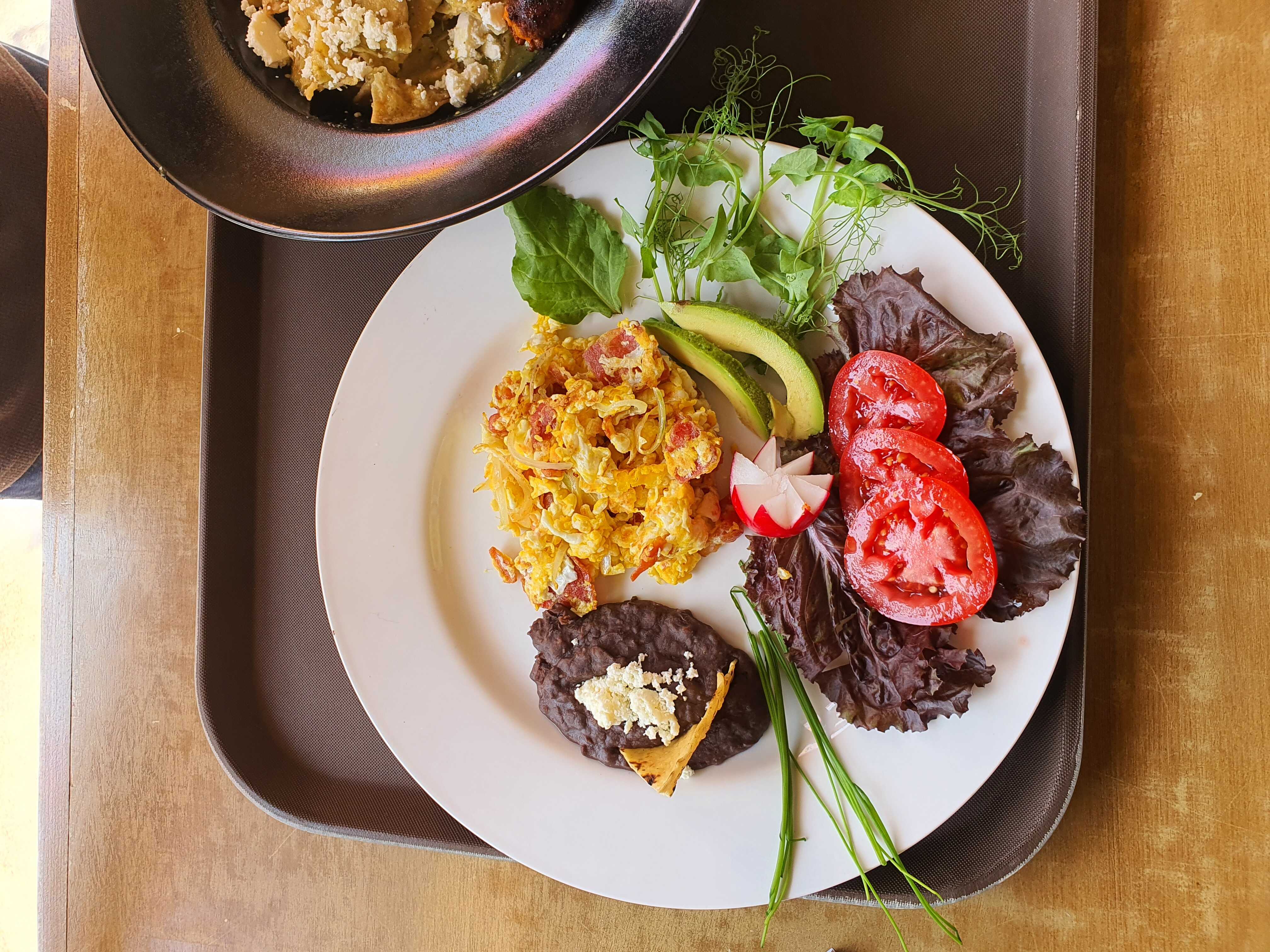 Huevos estrellados, servidos sobre una base de tortilla frita, bañados con salsa roja y verde, servidos con frijoles refritos.