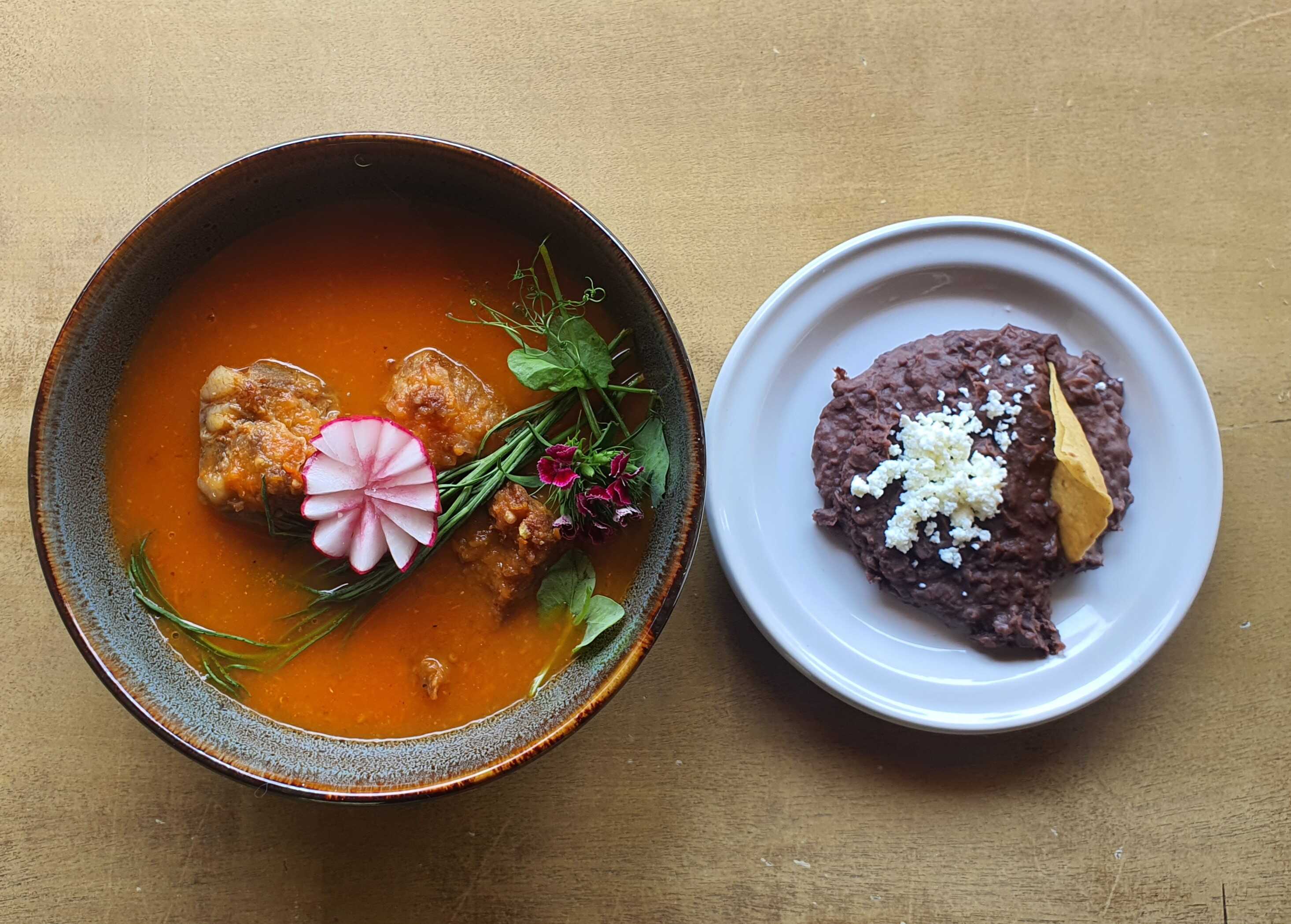 Costilla de cerdo frita, servida en salsa picante de tomate sazonada, acompañada de frijoles refritos.