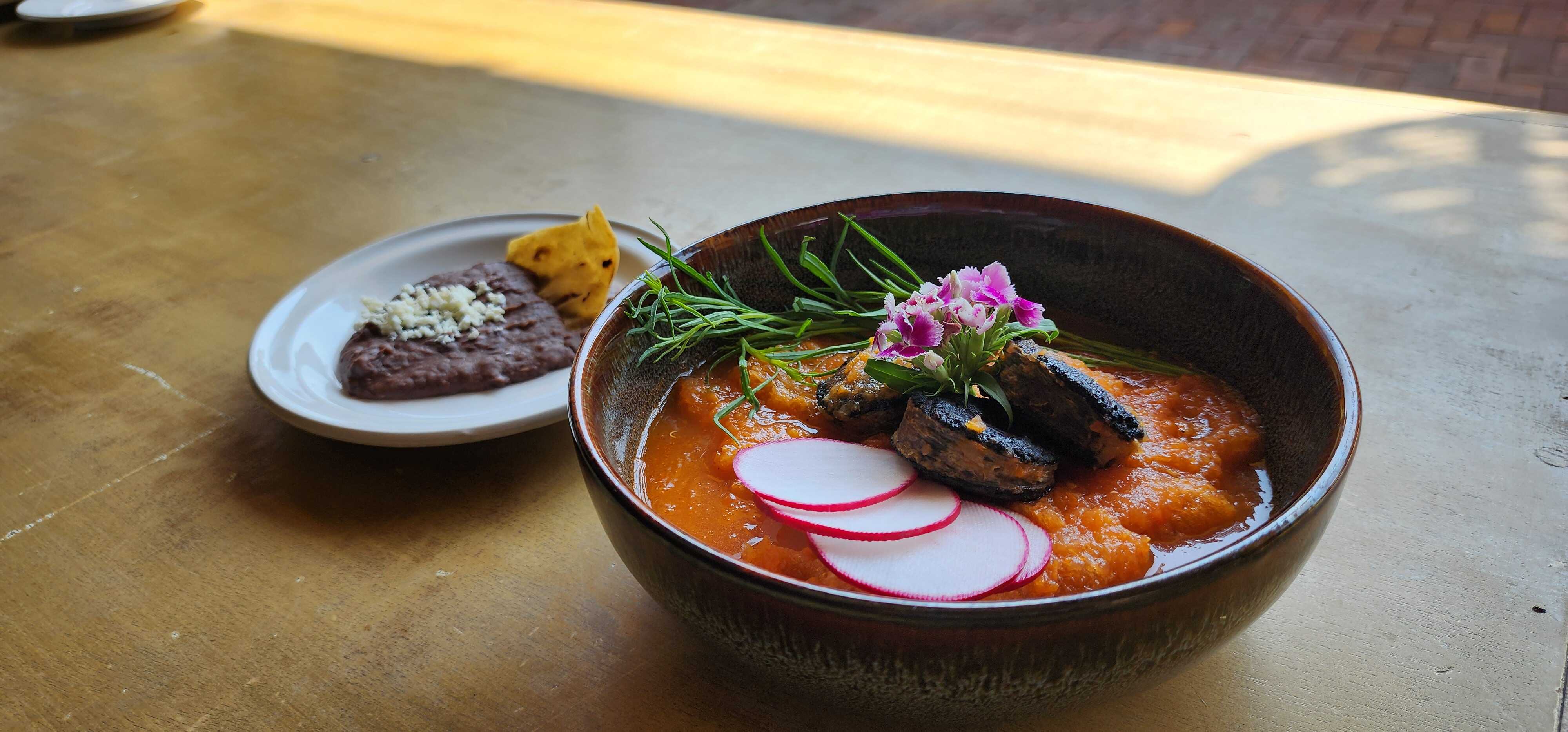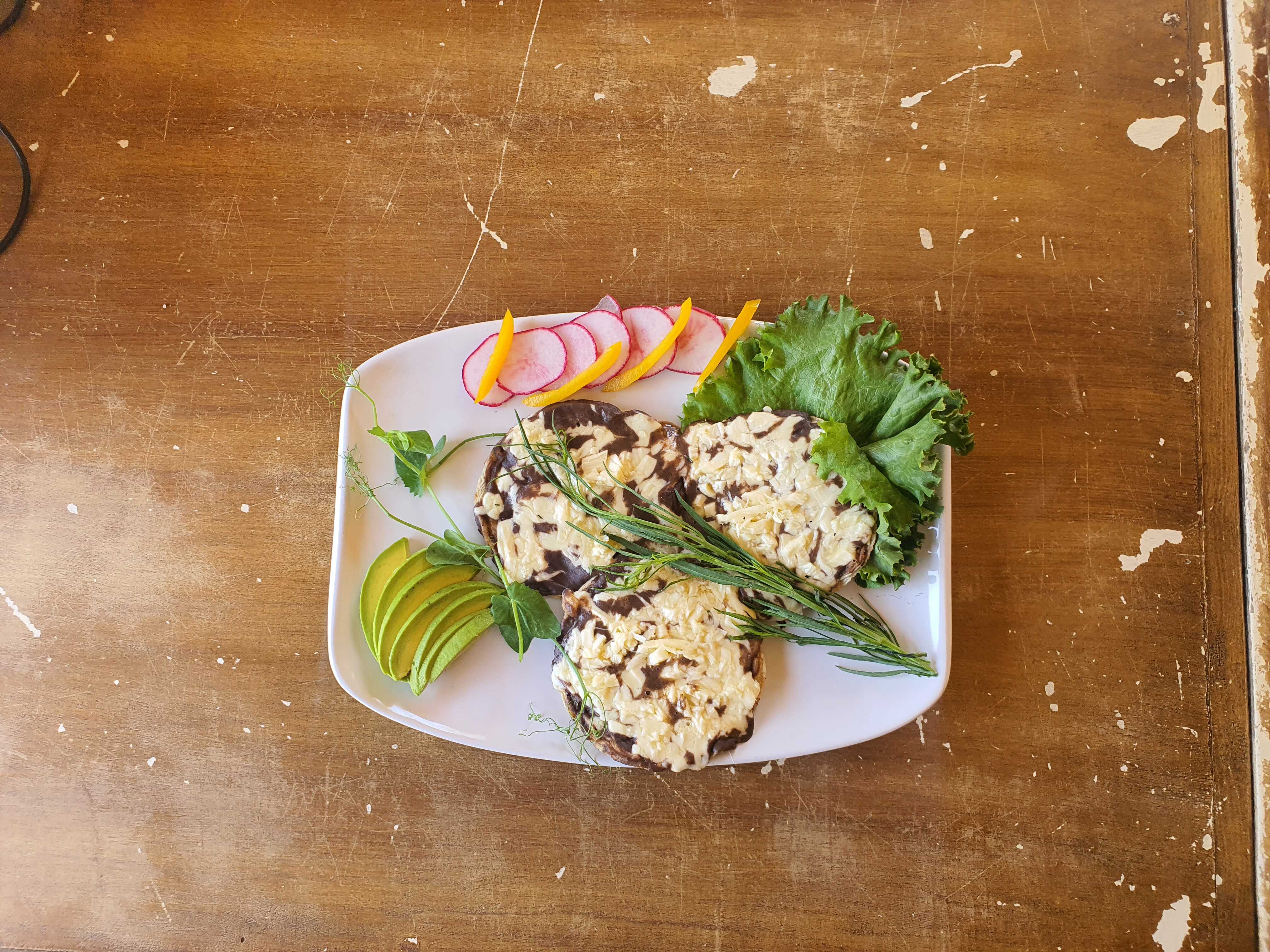 Servida con frijoles refritos, rebanada de queso fresco, chile asado y ensalada fresca.
