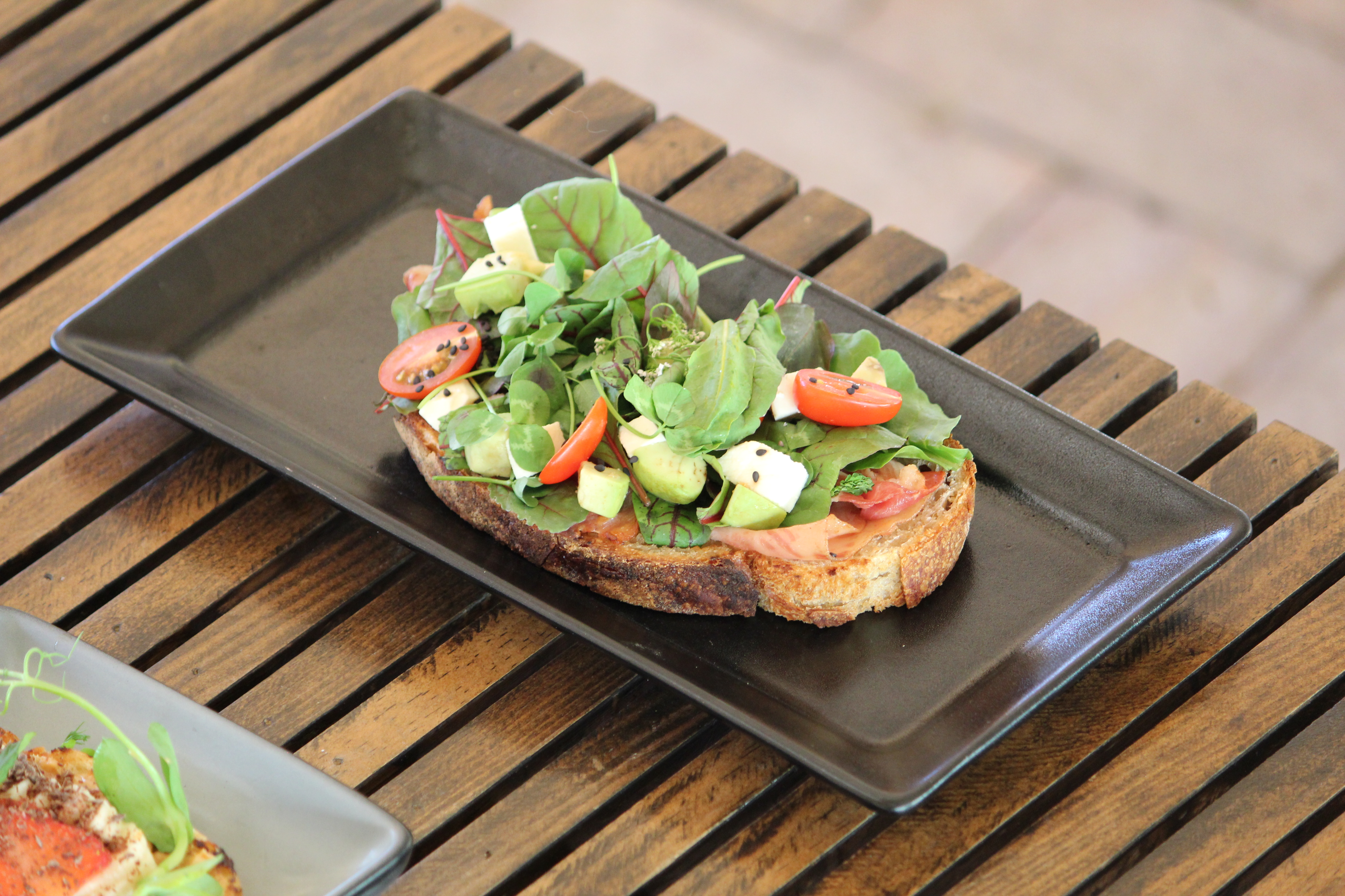 Pan de masa madre, jamón, tocino, queso fresco, tomate cherry, aguacate, ajonjolí y mix de hojas.