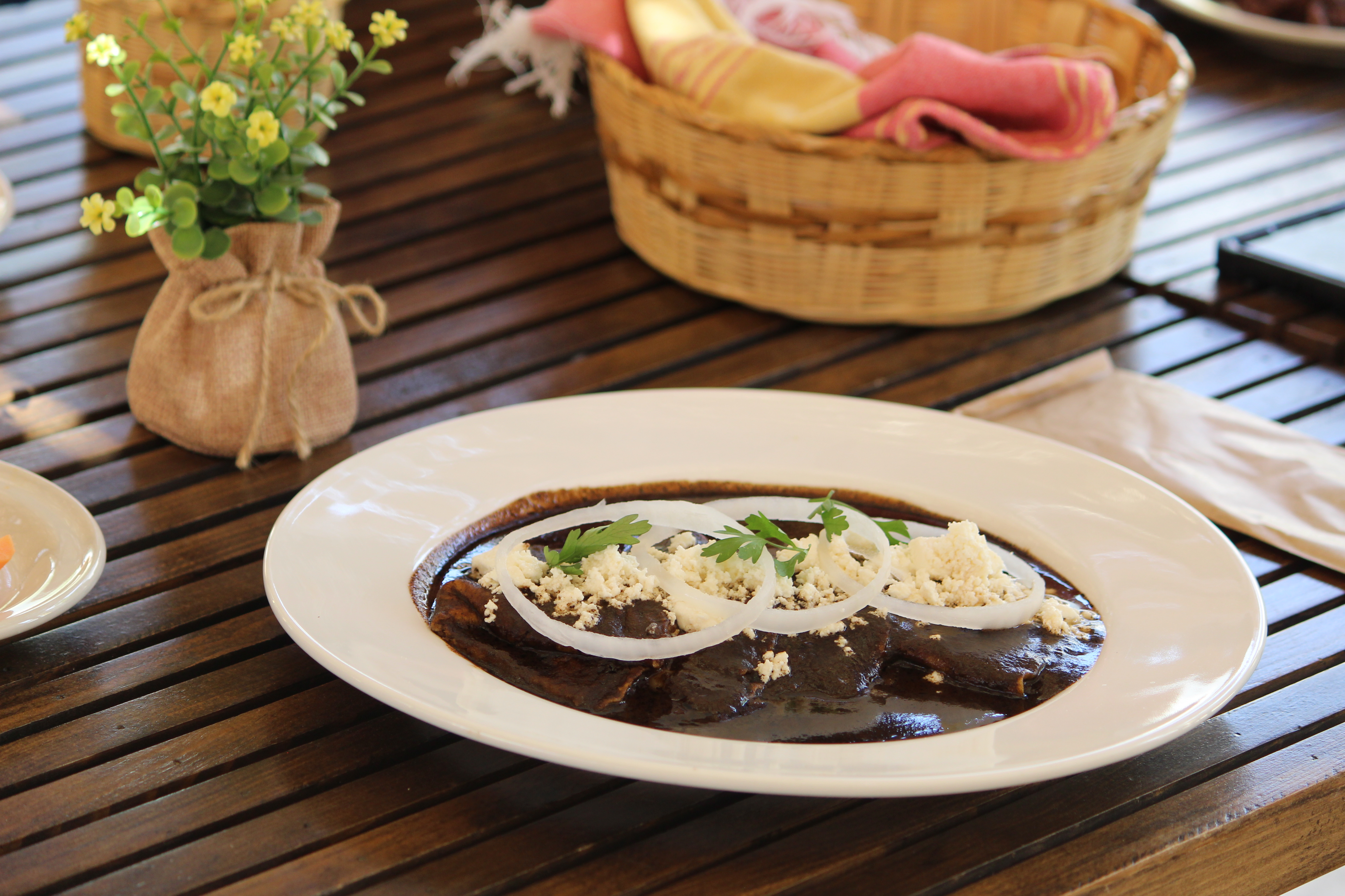 Tortillas de maíz bañada con mole negro, servidas con queso fresco y cebolla.