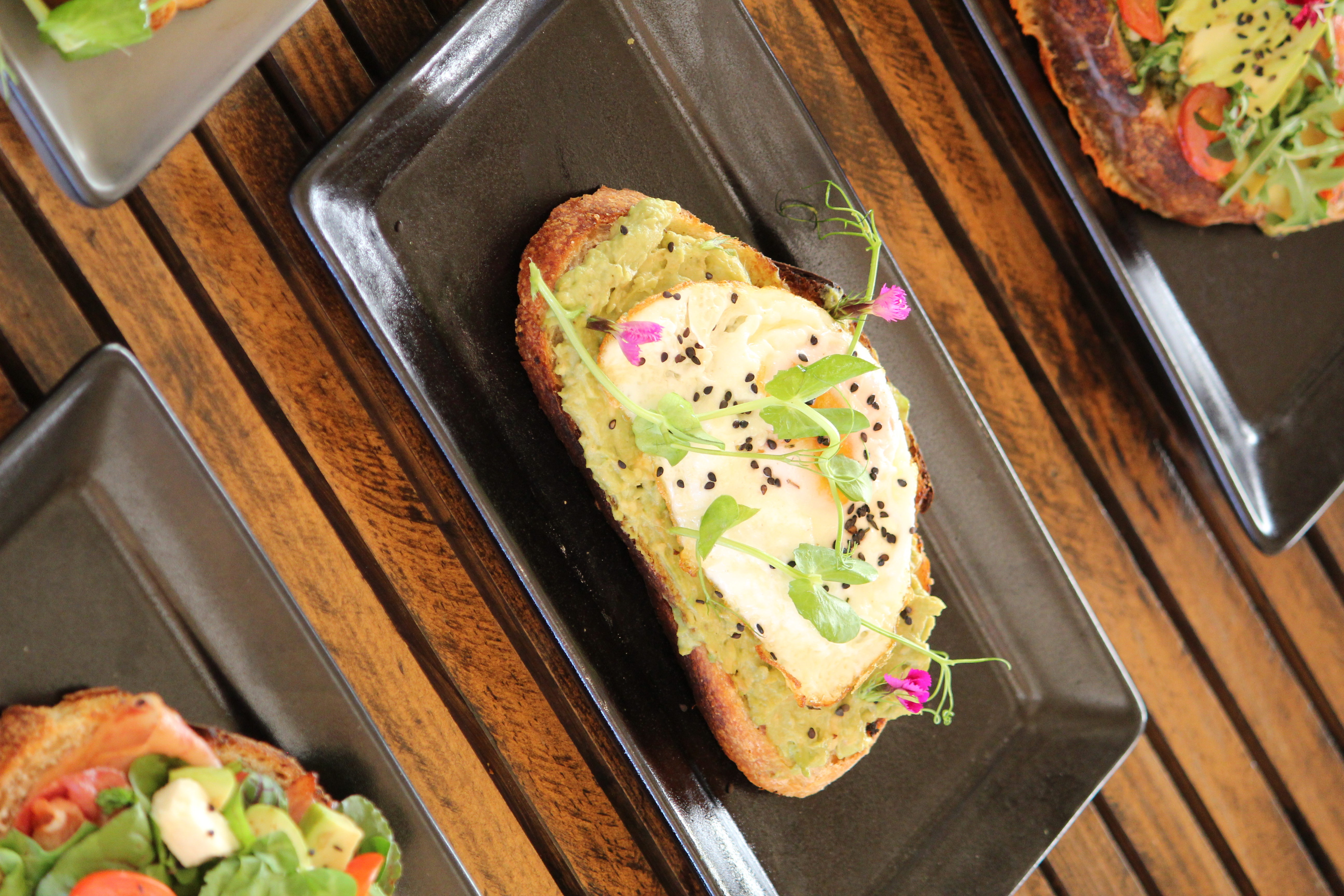 Pan de masa madre, cama de aguacate y huevo estrellado con una pizca de ajonjolí negro.