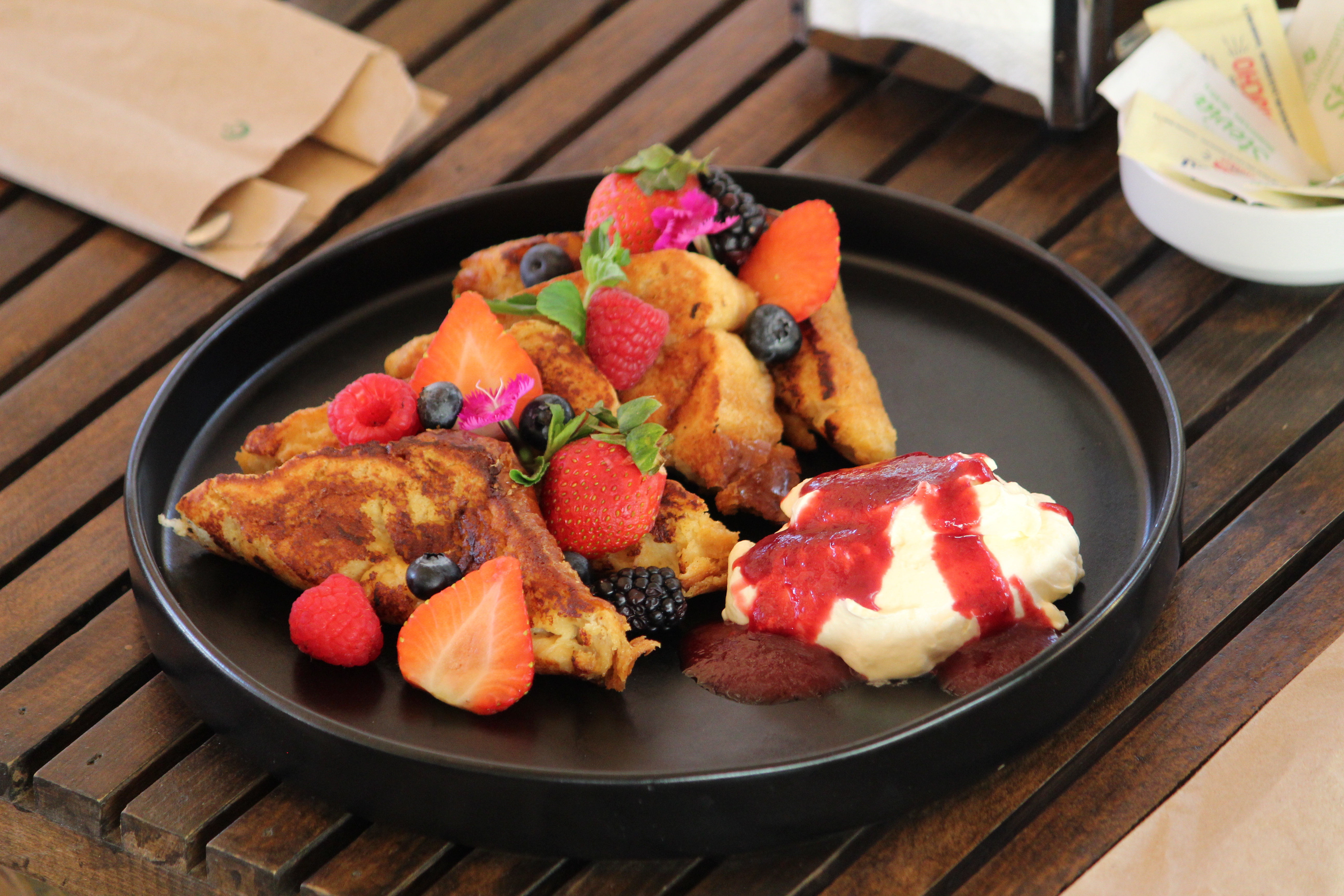 Acompañados con rema batida y coulis de frutos rojos.