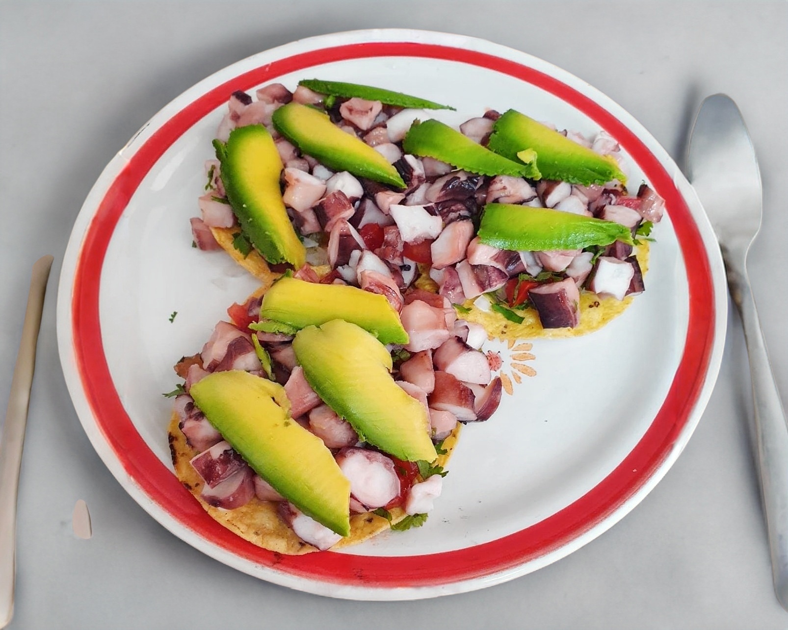 pulpo acompañado con cilantro, cebolla, tomate y aguacate