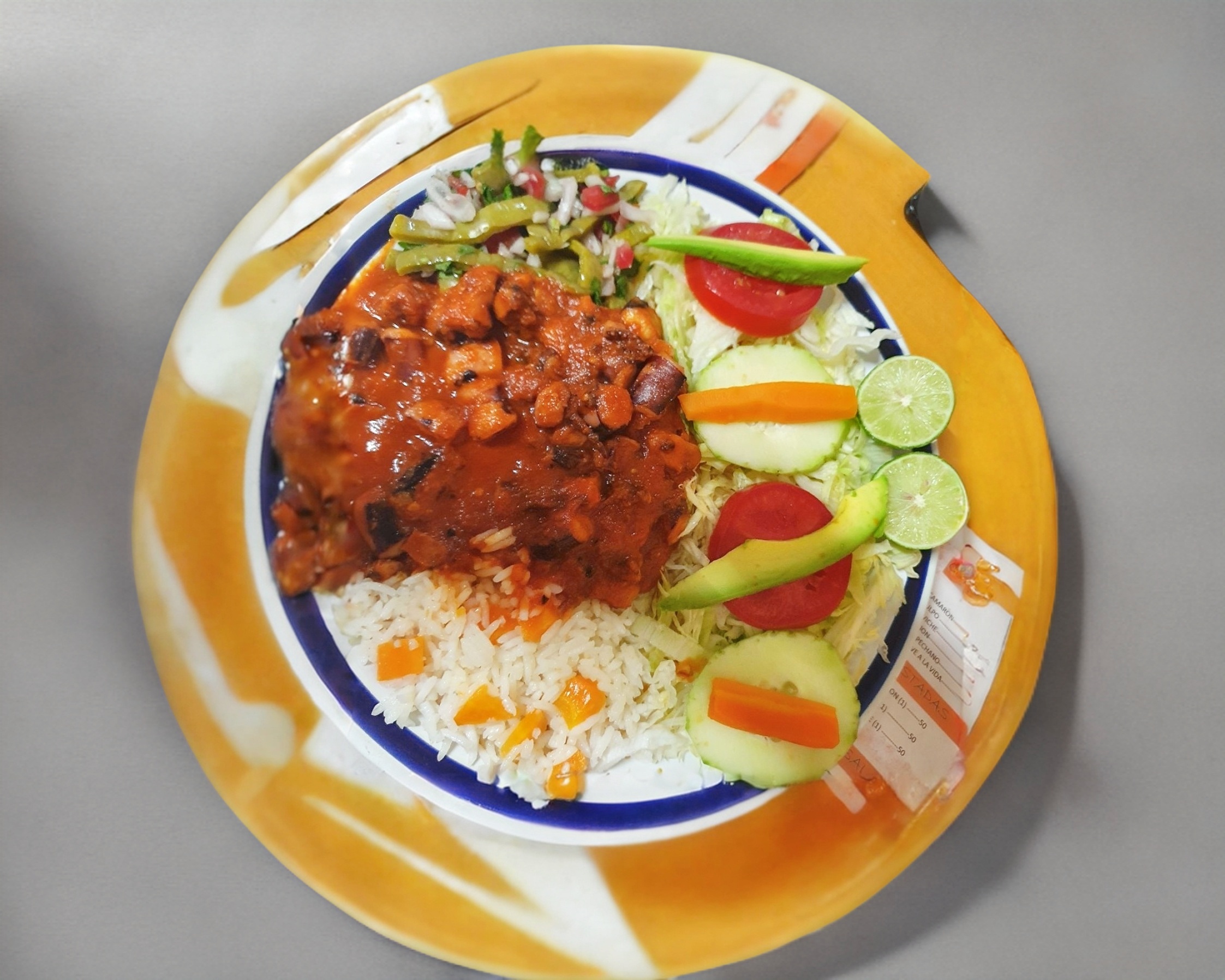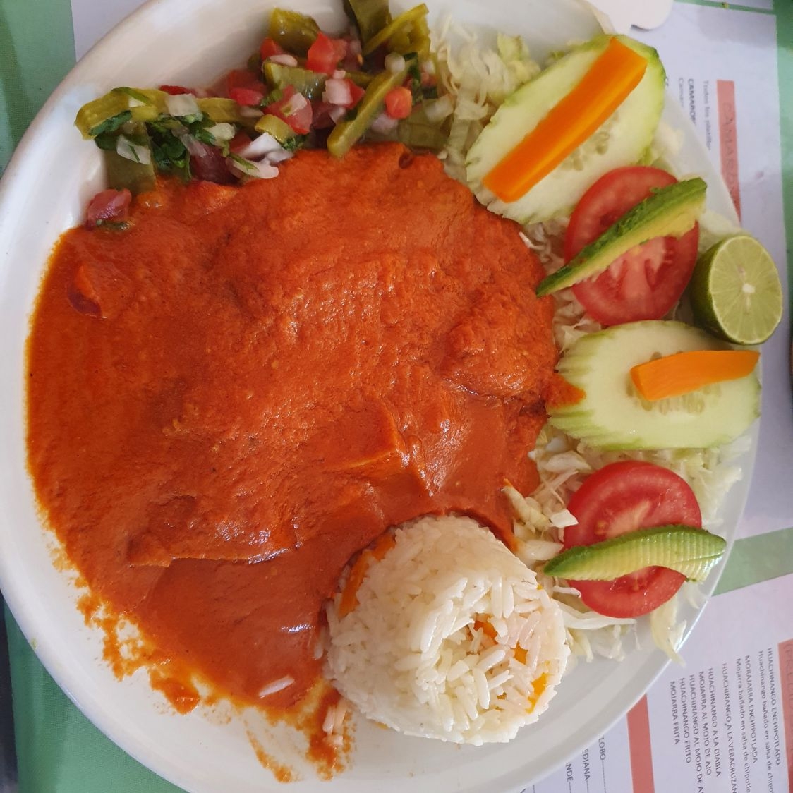 Pescado frito y marinado, bañado en deliciosa salsa de chipotle, acompañado de ensalada verde, nopales y arroz.