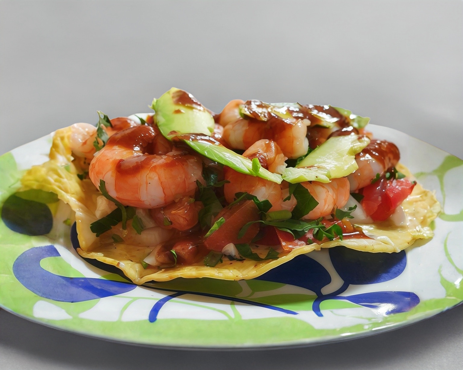 Camaron mezclado con tomate, cebolla, cilantro y mayonesa, aderezado con salsa de la casa.