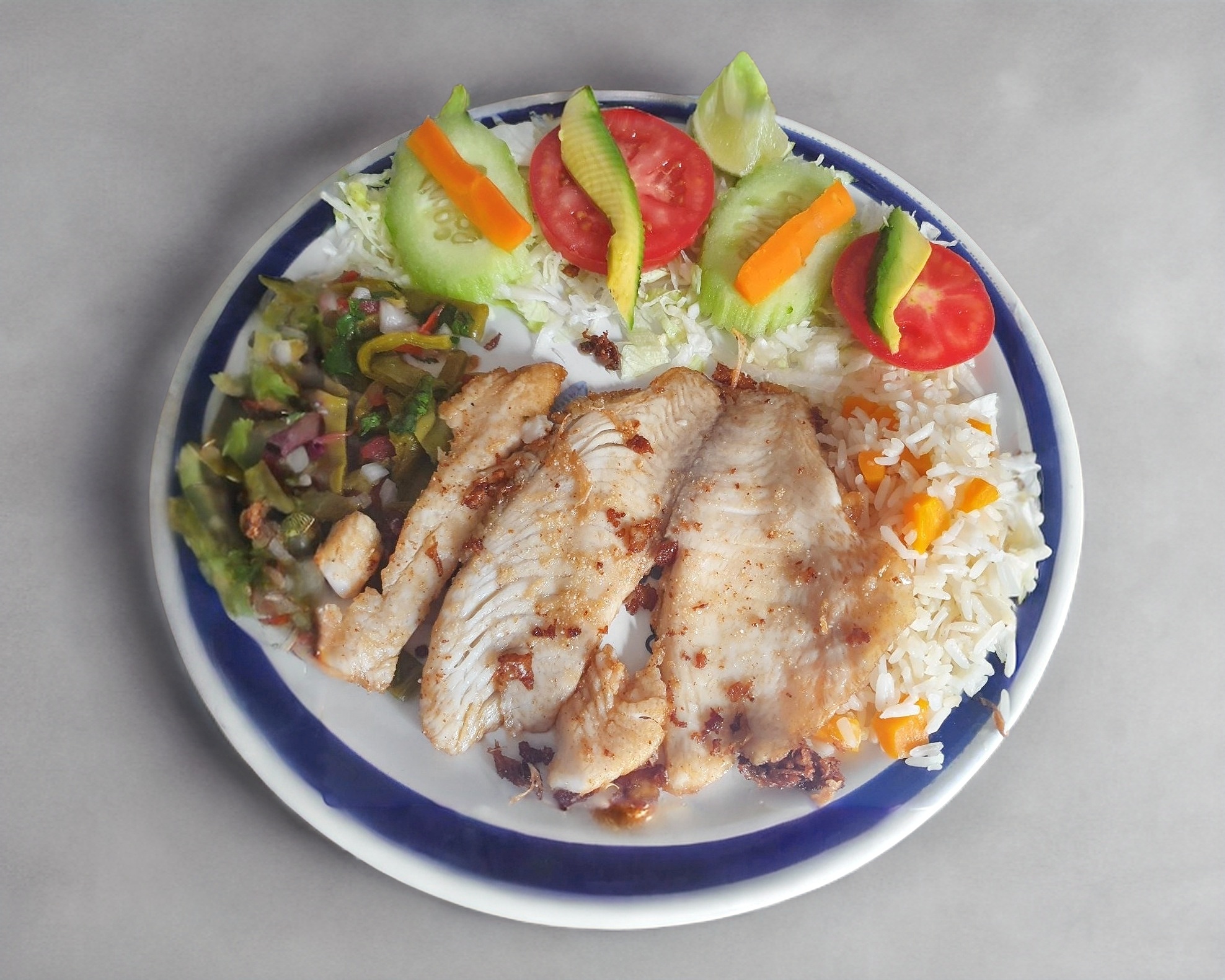 Filete de pescado, acompañado con arroz, ensalada verde y ensalada de nopales