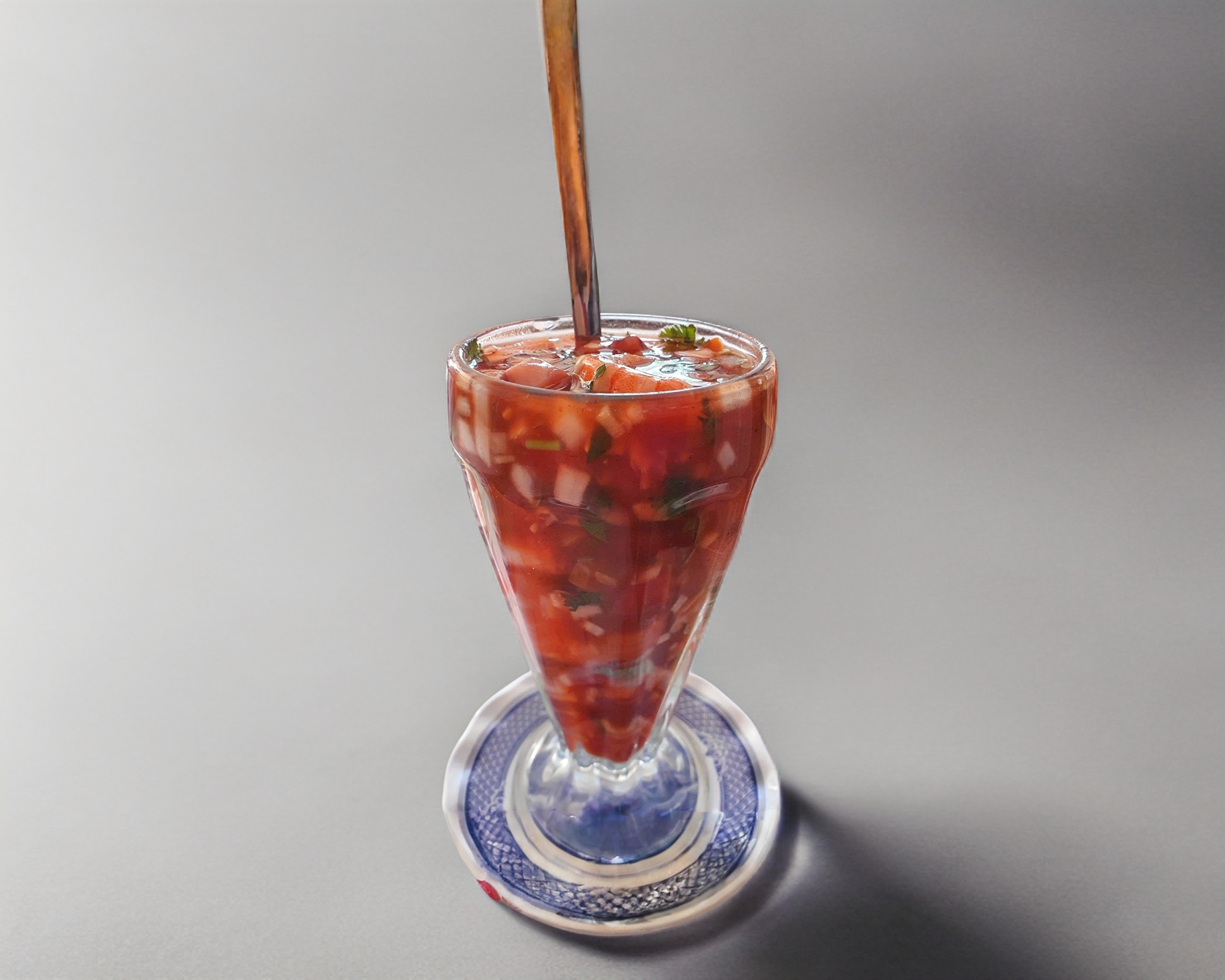 pulpo mezclado con tomate, cebolla, cilantro y mayonesa, aderezado con salsa de la casa.