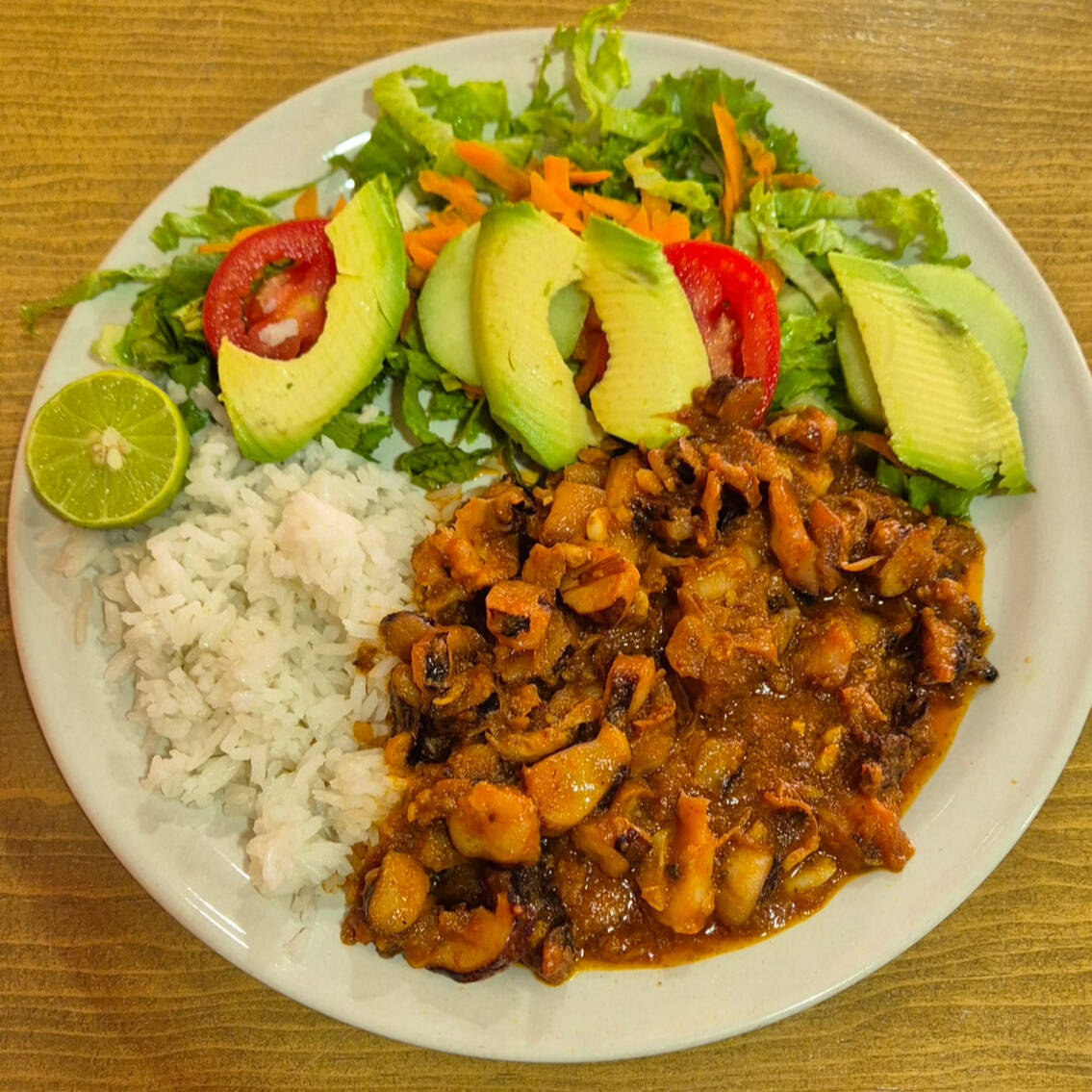 Pulpo bañado en salsa de chipotle acompañado de arroz, nopales y ensalada verde.