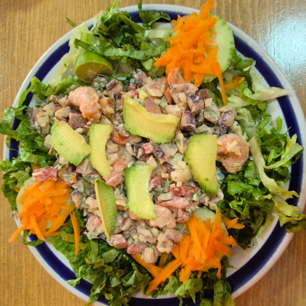 Ceviche mezclado con tomate, cebolla, cilantro y mayonesa, aderezado con salsa de la casa.