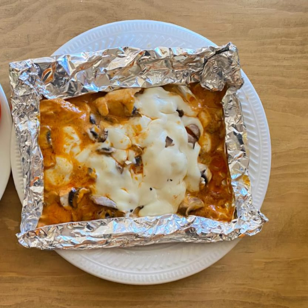 Filete de pescado empapelado bañado en aderezo con champiñones y quesillo.