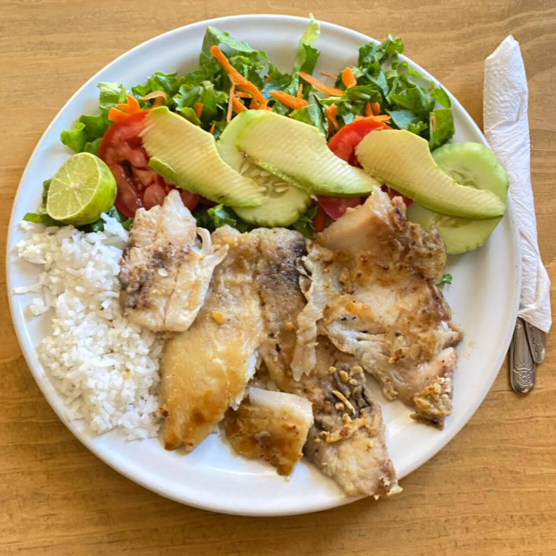 Pescado marinado en ajo y frito, acompañado de ensalada verde, nopales y arroz.