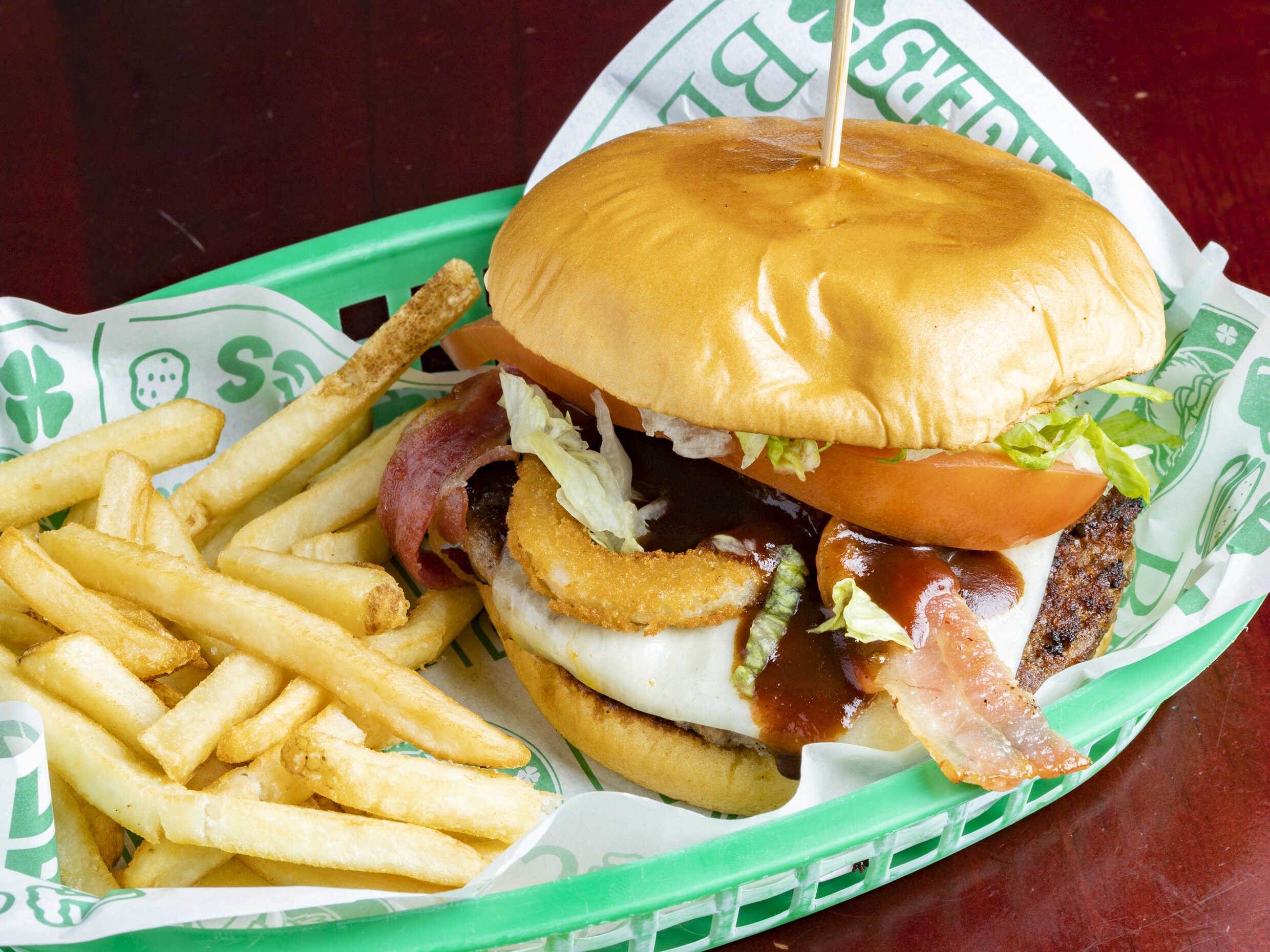 "Deliciosa selección de carne (220g) cubierta en BBQ con esencia de Bourborn, tocino, queso americano, lechuga, jitomate y aros de cebolla. Con papas a la francesa."