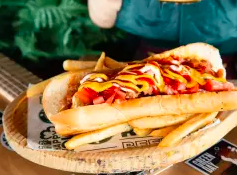 "Deliciosa hamburguesa de carne (220g) aderezo blue cheese, tocino, queso americano.Con papas a la francesa."