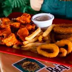 6 ALITAS A ELEGIR, 6 AROS DE CEBOLLA , 5 DEDOS DE QUESO , 6 BONELESS MACCARTHYS Y PAPAS 150 GRAMOS.