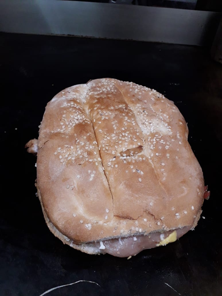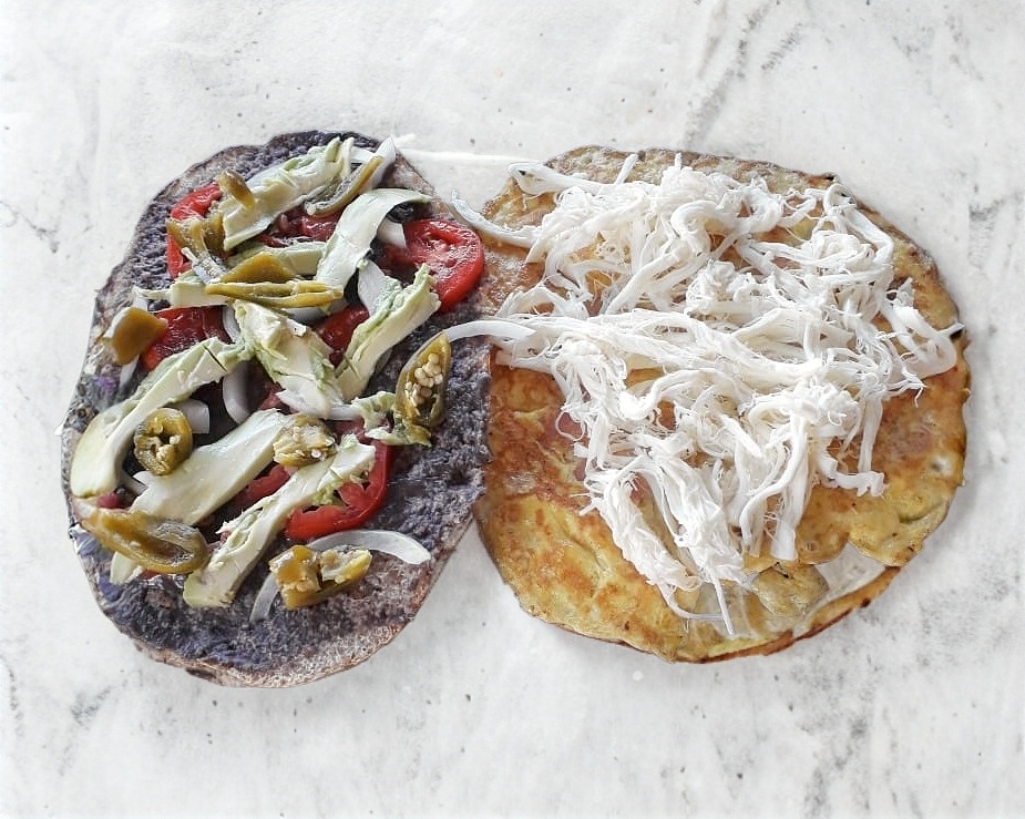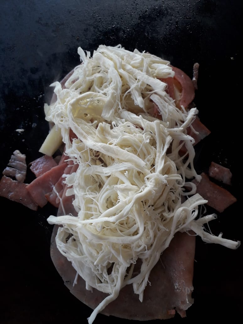 Tocino, jamón,piña y quesillo pan fresco, frijol, mayonesa, aguacate, tomate y chiles